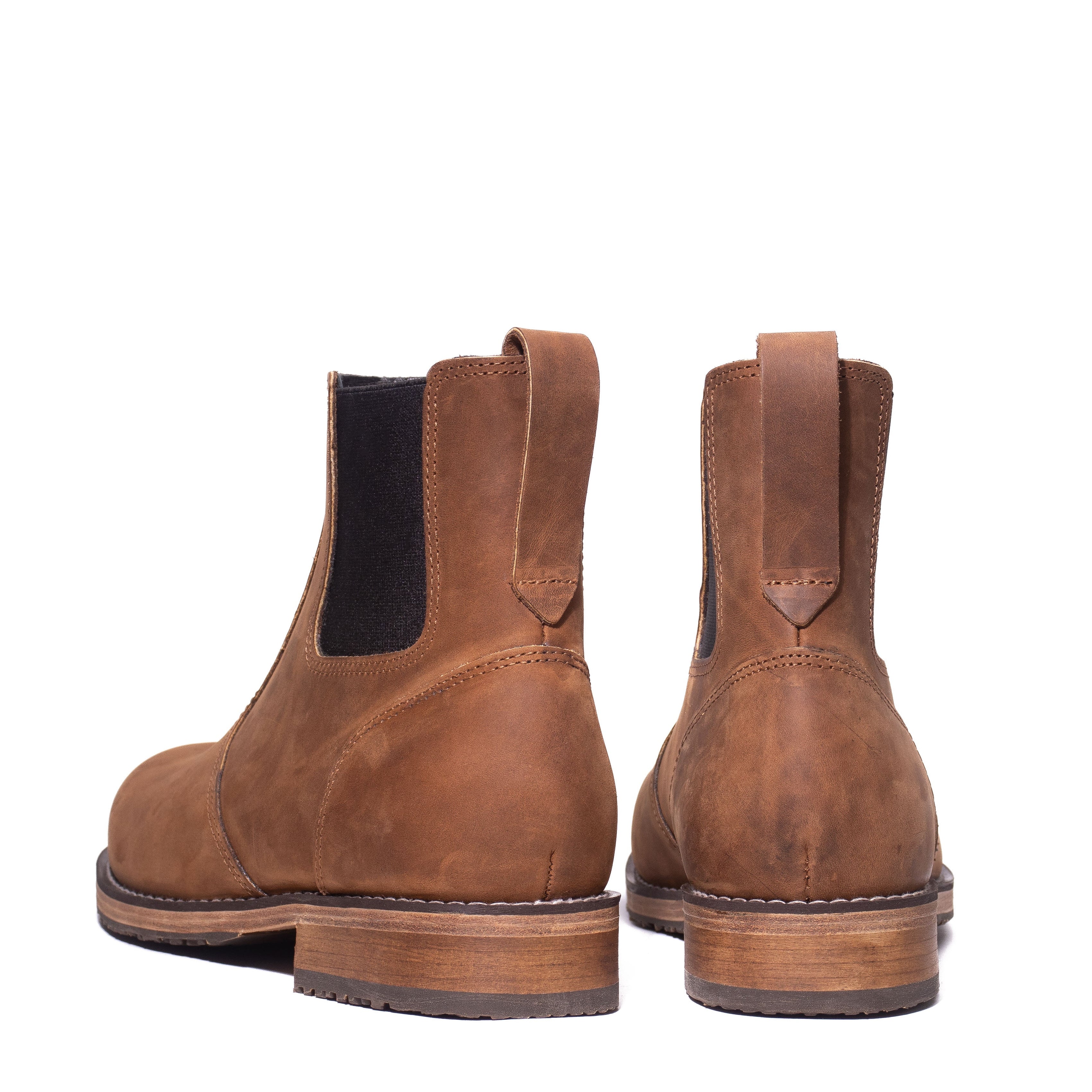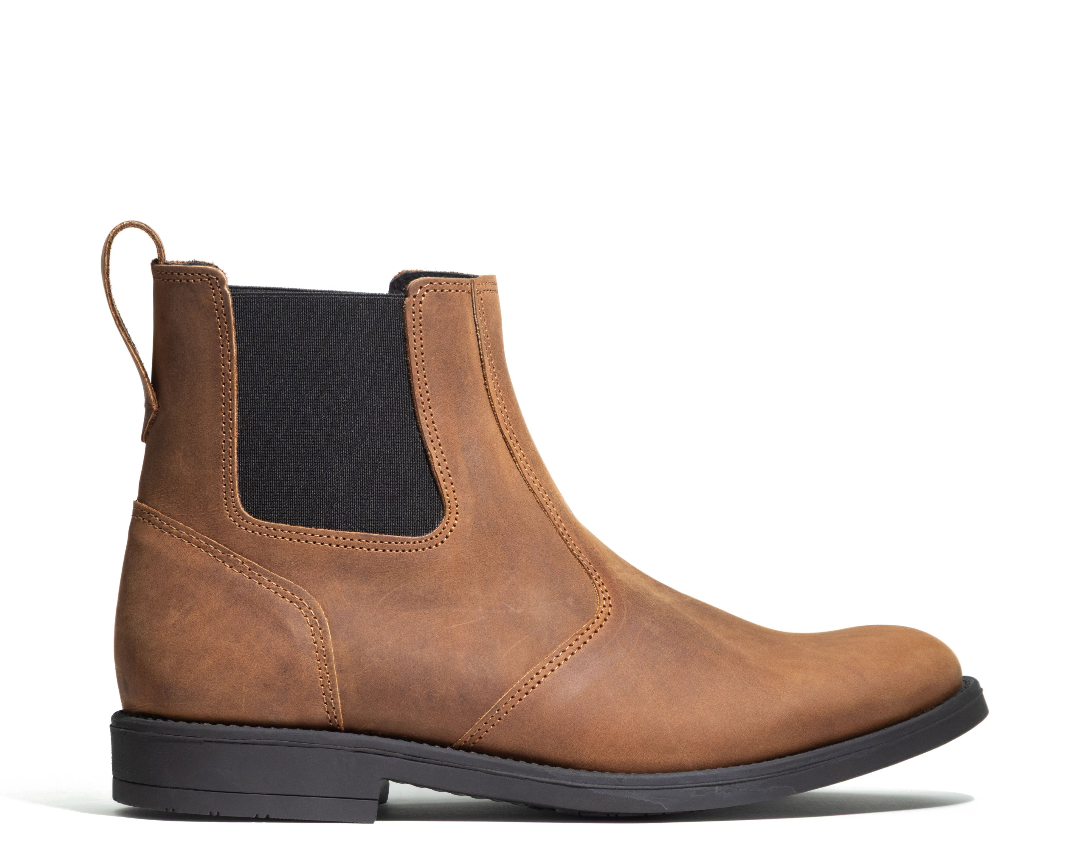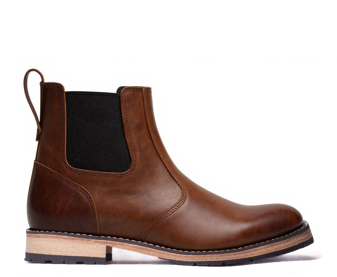 Men’s Chelsea boots (13 cm) in premium leather with elastic side gores and a rear pull tab for easy entry. Shown in Rustic Brown. Handmade in Laconia for comfort and durability — from city streets to easy weekend walks.