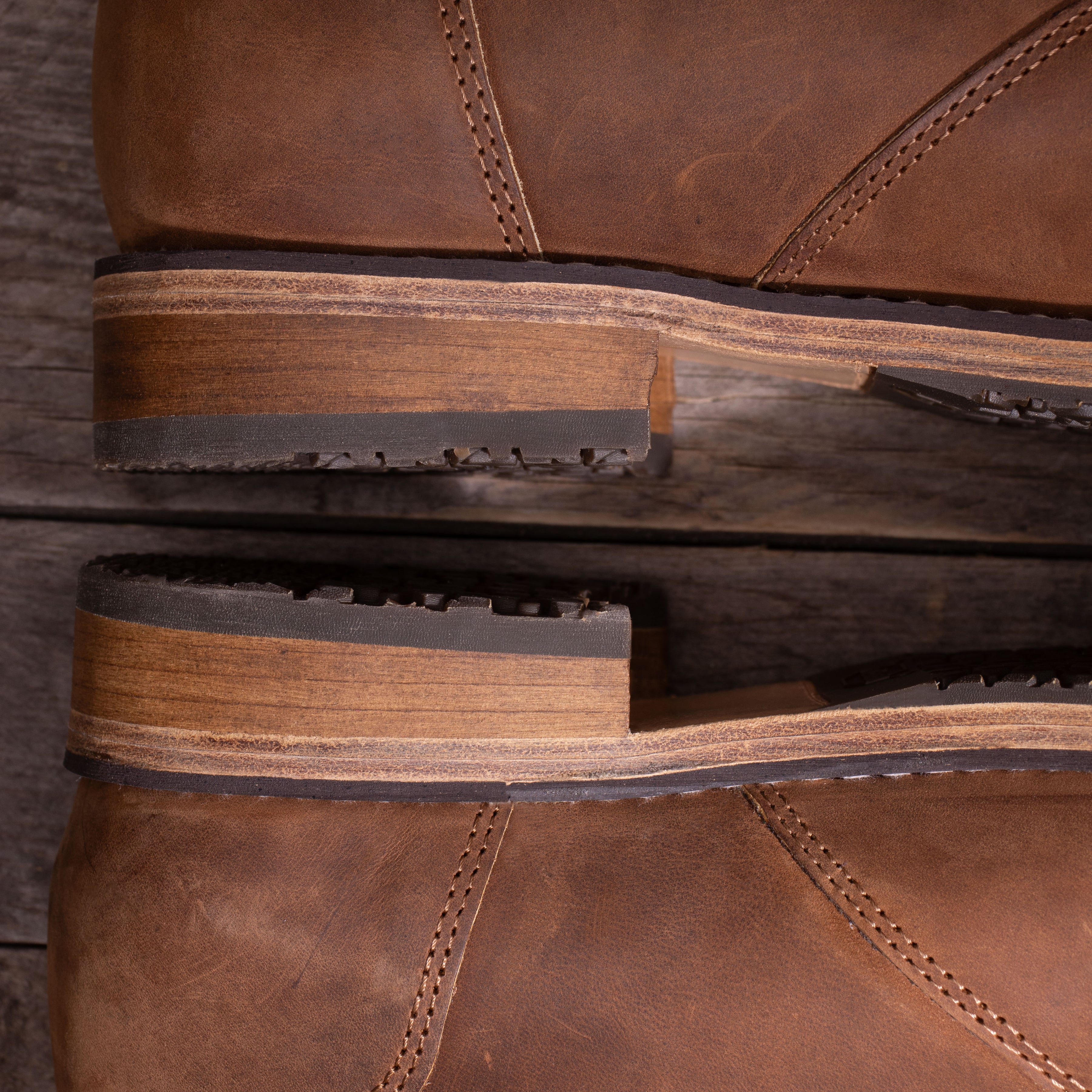 • Two high-quality sole options — (1) Low-Profile Sole, (2) Upgraded Heritage Sole featuring a double-stacked full-grain leather midsole and a solid wooden heel, both glued and nailed for strength and stability, with a half-stitched construction that allows future resoling and repairs.