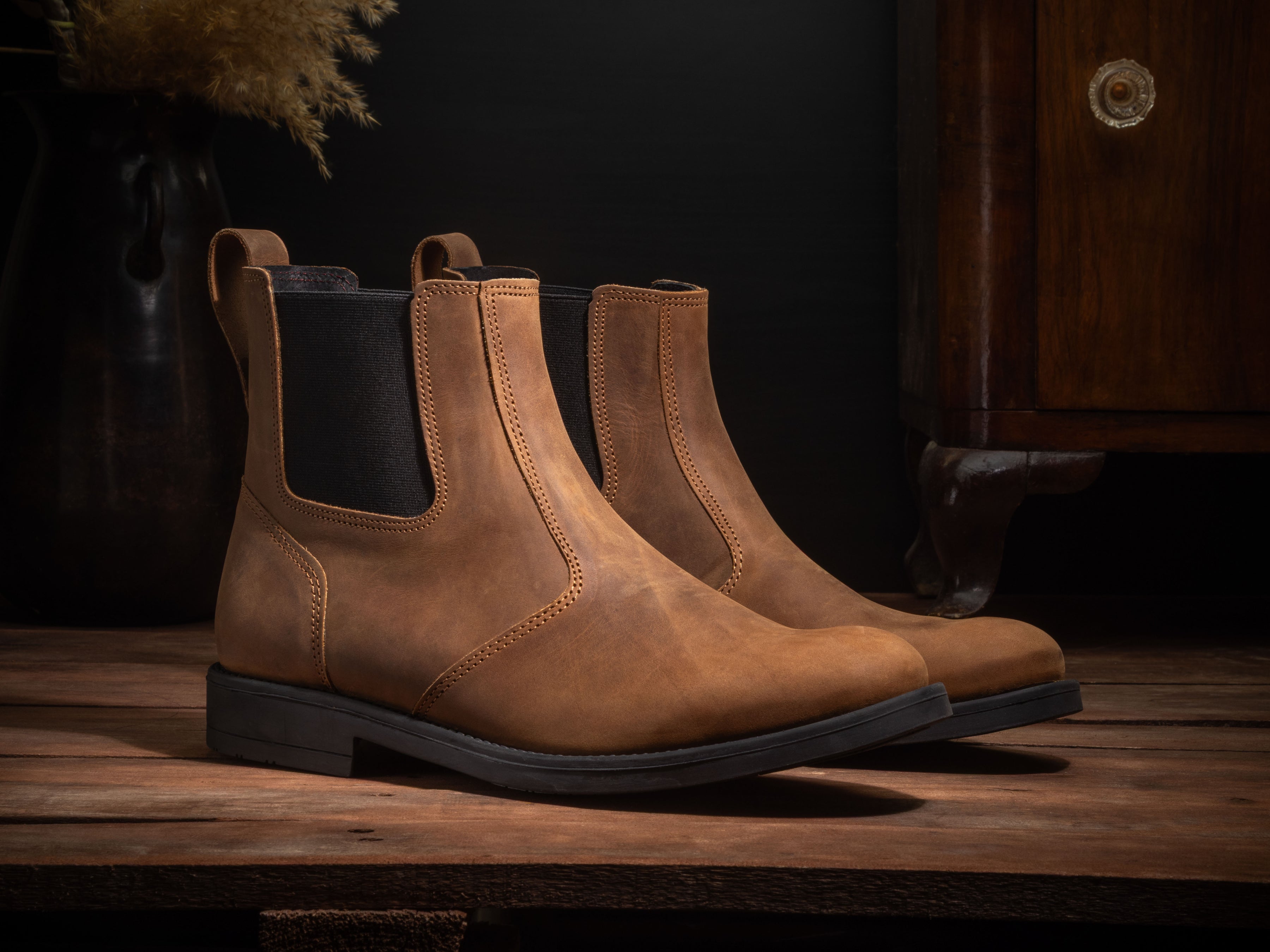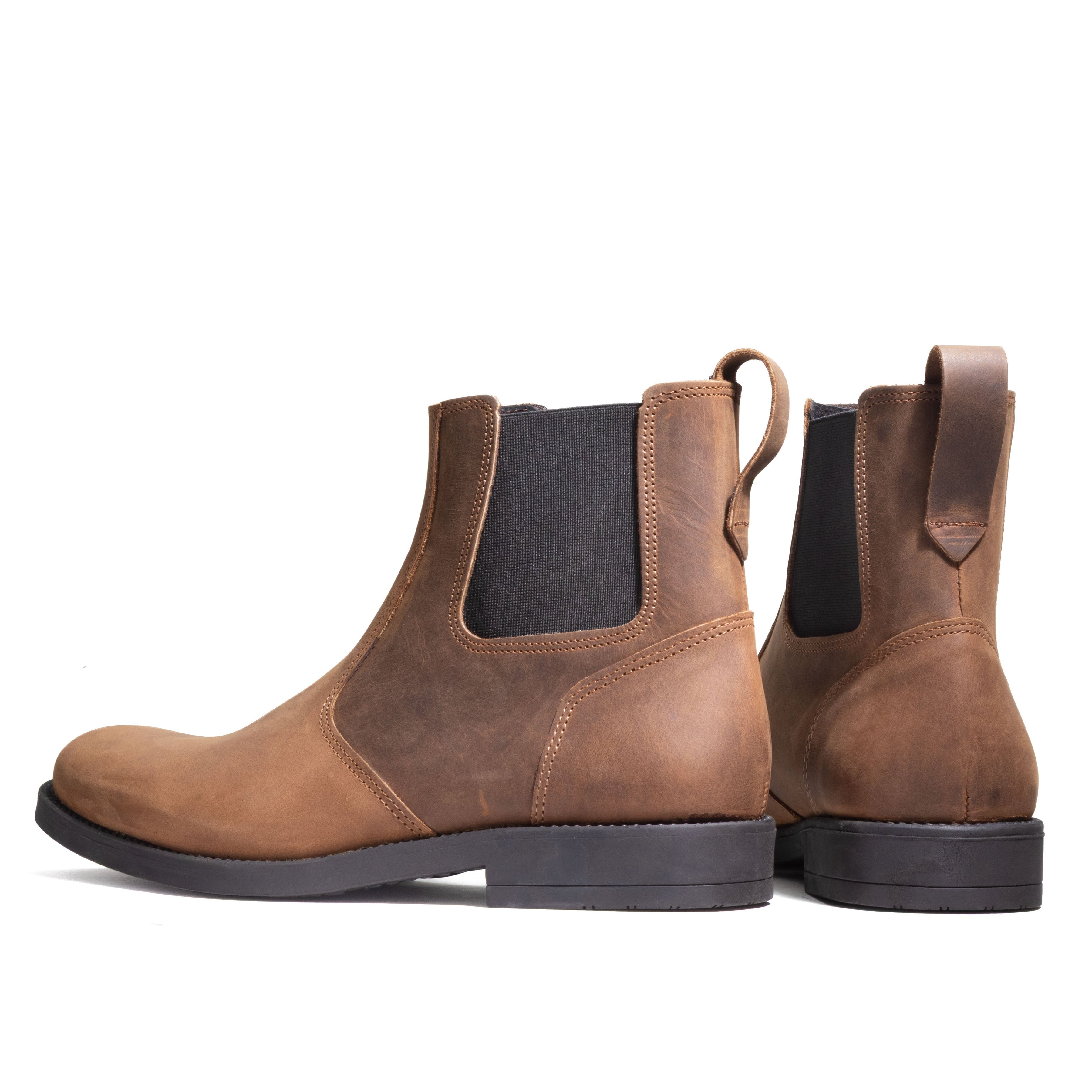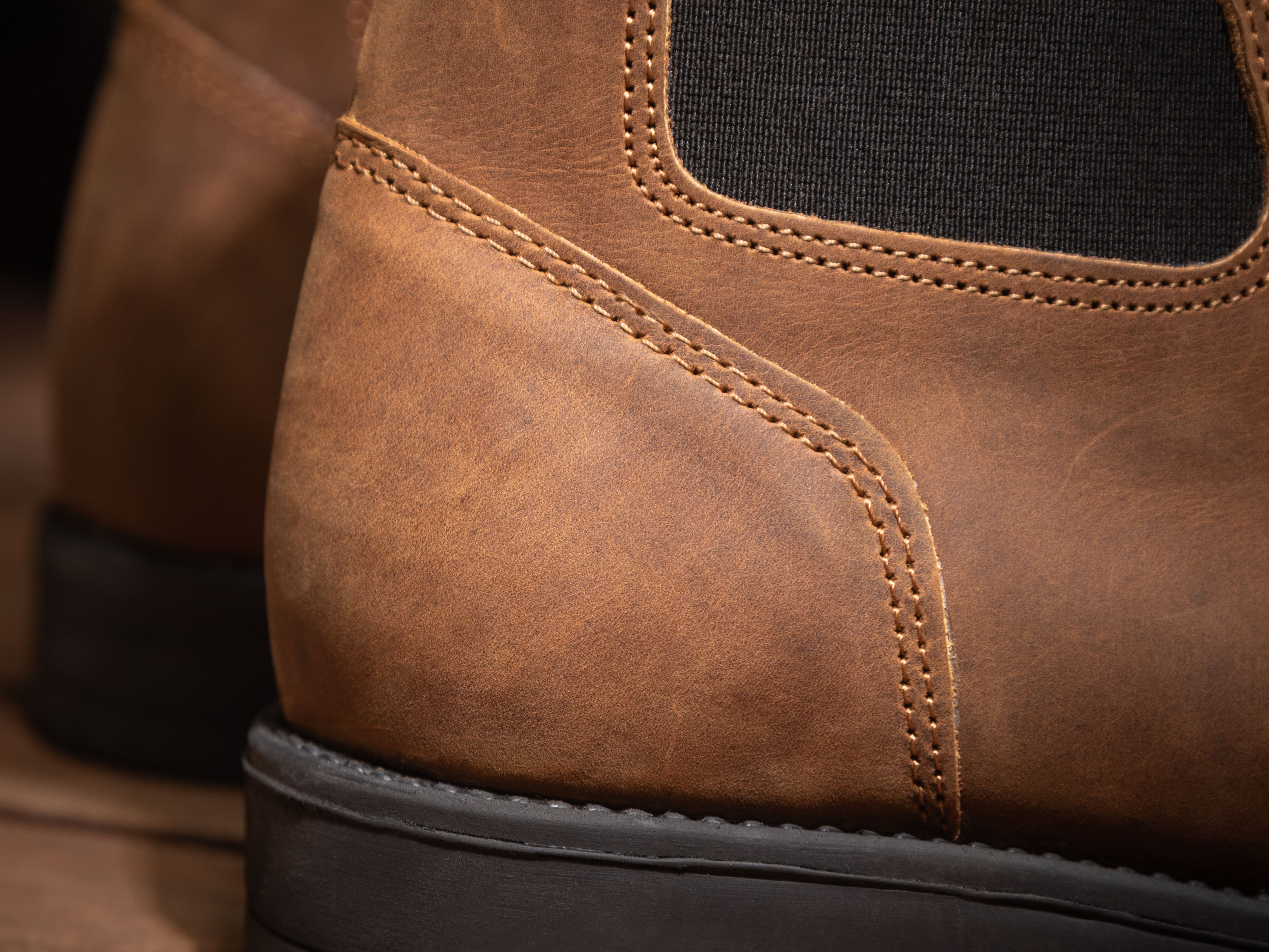 Men’s 5" (13 cm) top-grain leather Chelsea boots with elastic sides and a rear pull loop. Shown here in Rustic Brown. Handmade in Laconia, Greece, for comfort, durability, and real grip from weekday streets to weekend wander.