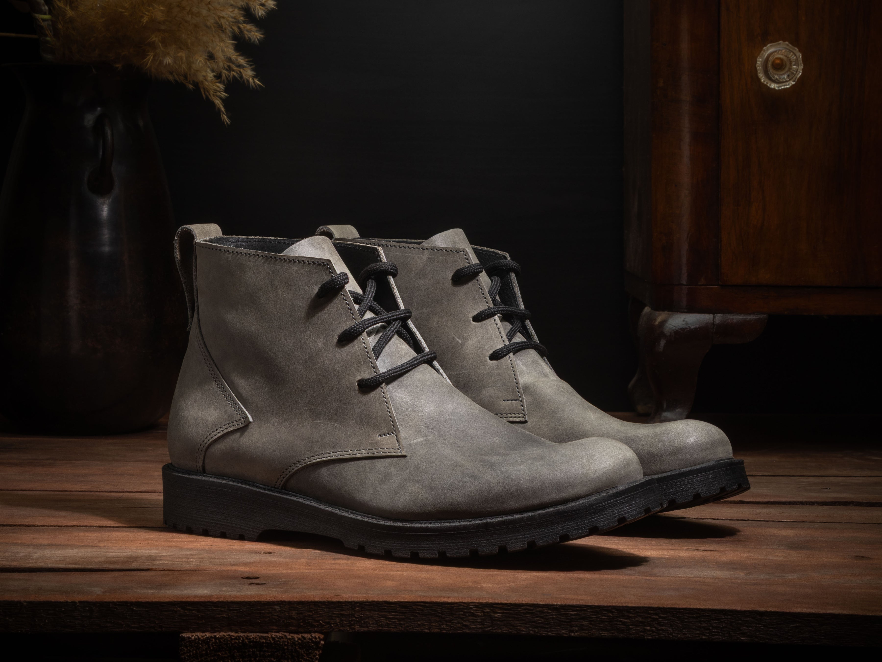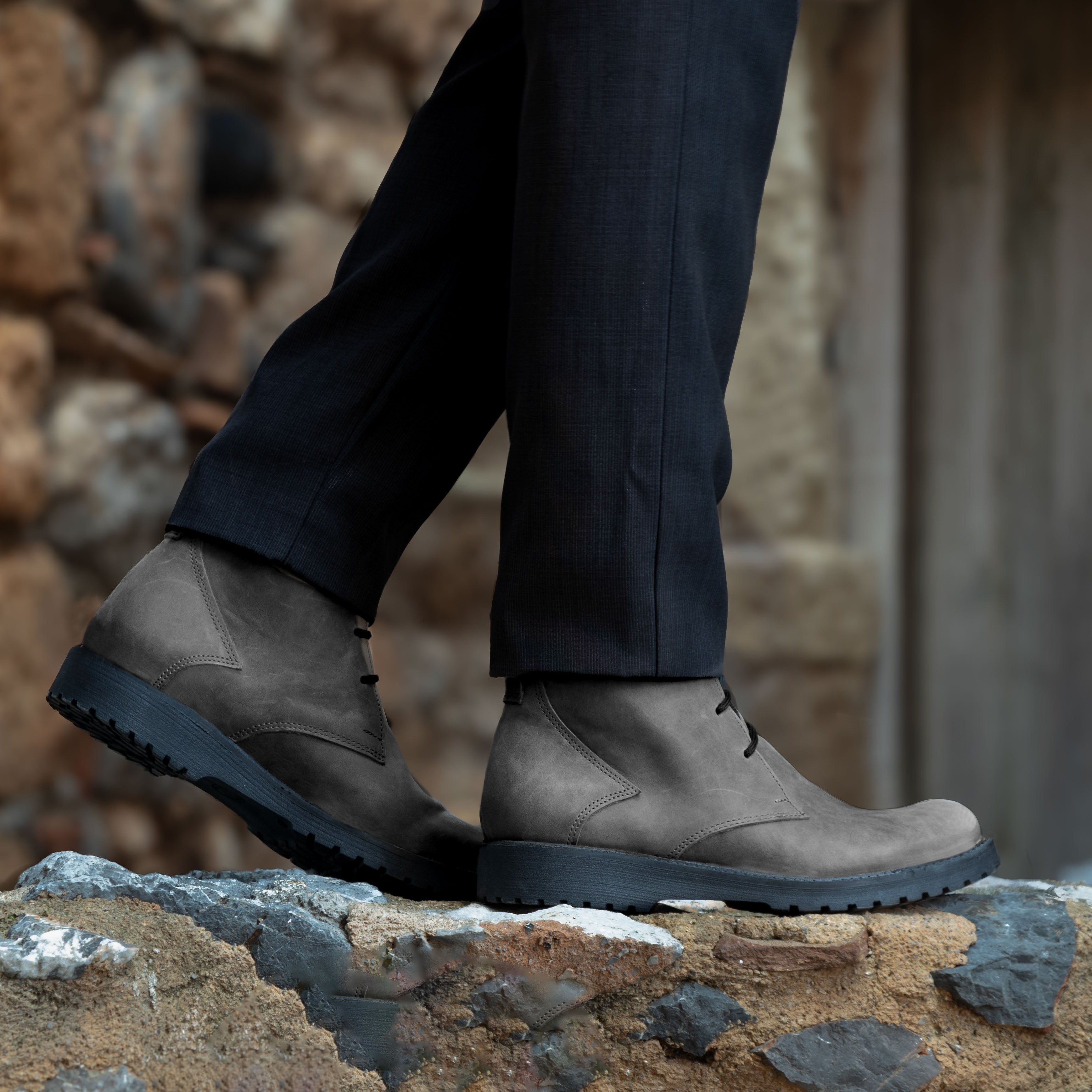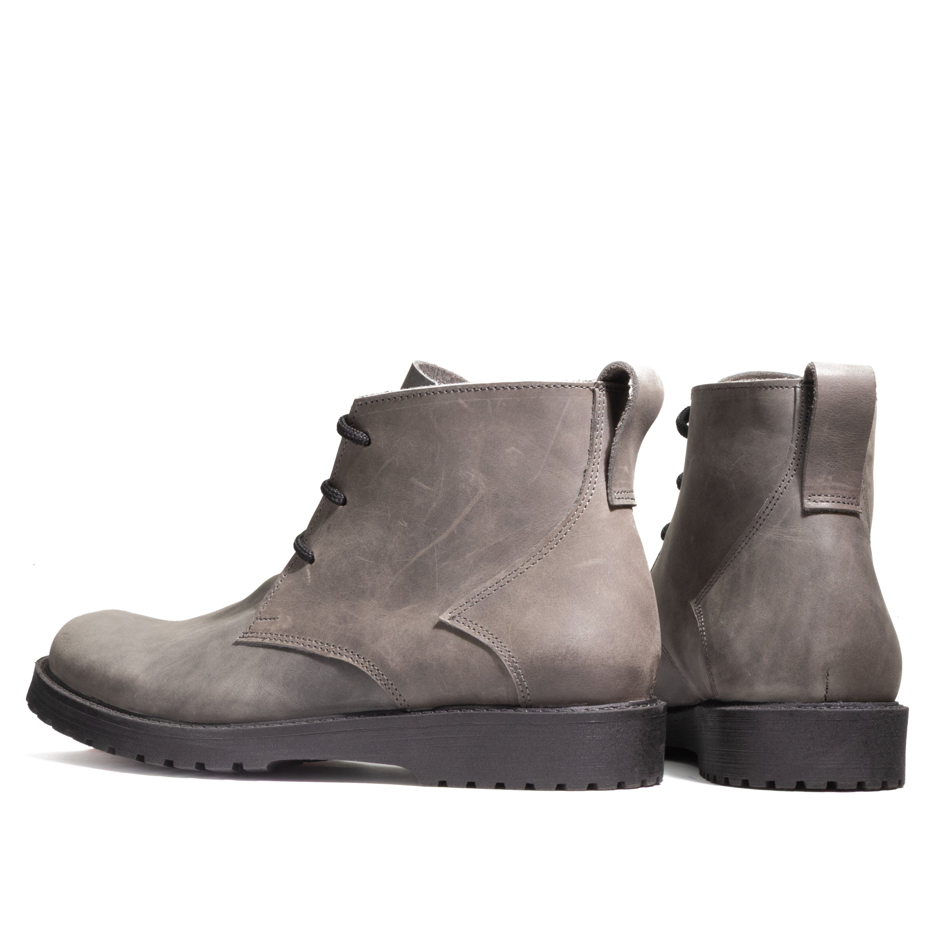Men’s 5" (13 cm) top-grain leather chukka with a 3-eyelet lace and rear pull loop. Shown here in Pullup Grey. Handmade in Laconia, Greece, delivering comfort, durability, and grip from city streets to weekend wander.
