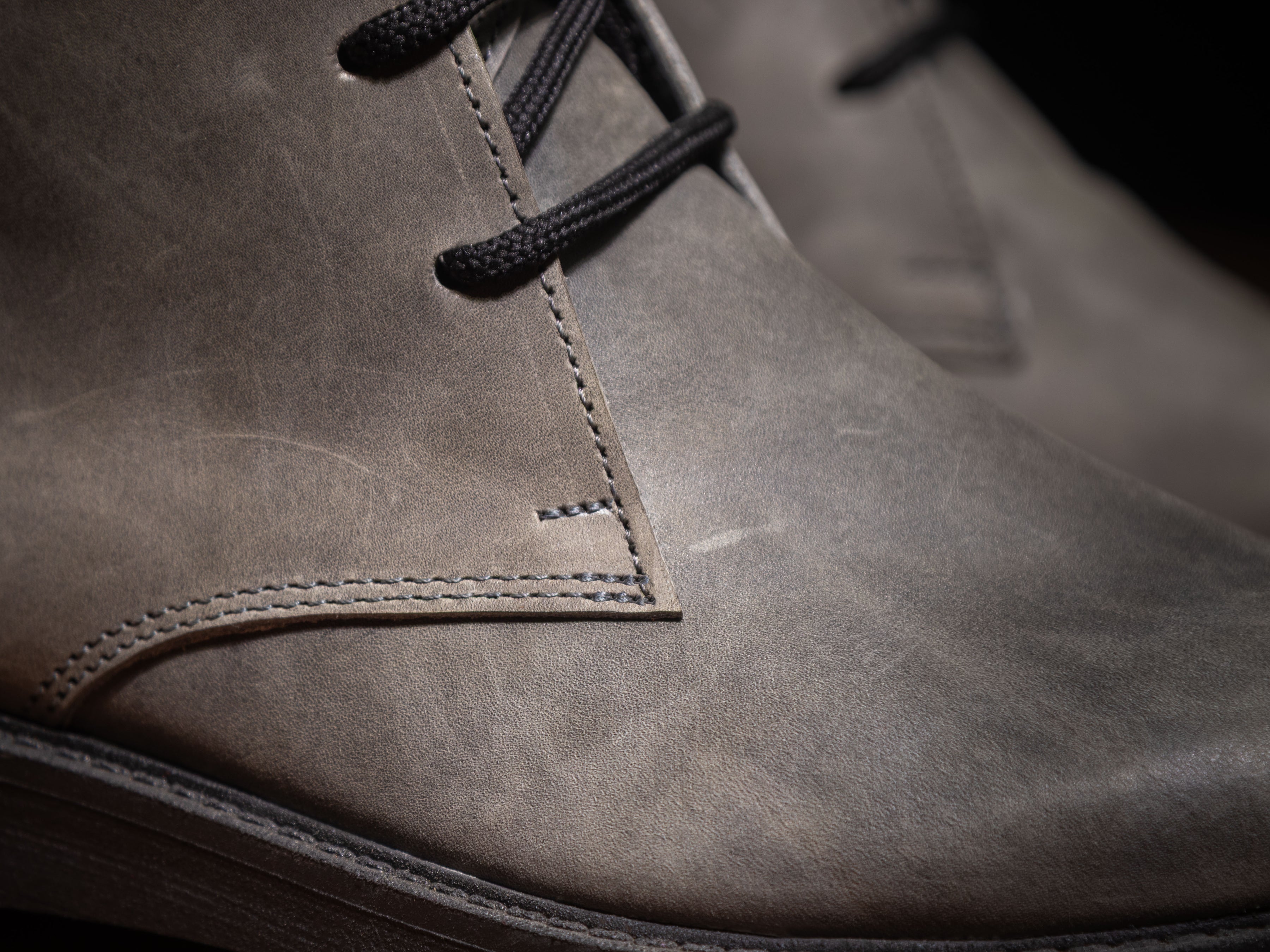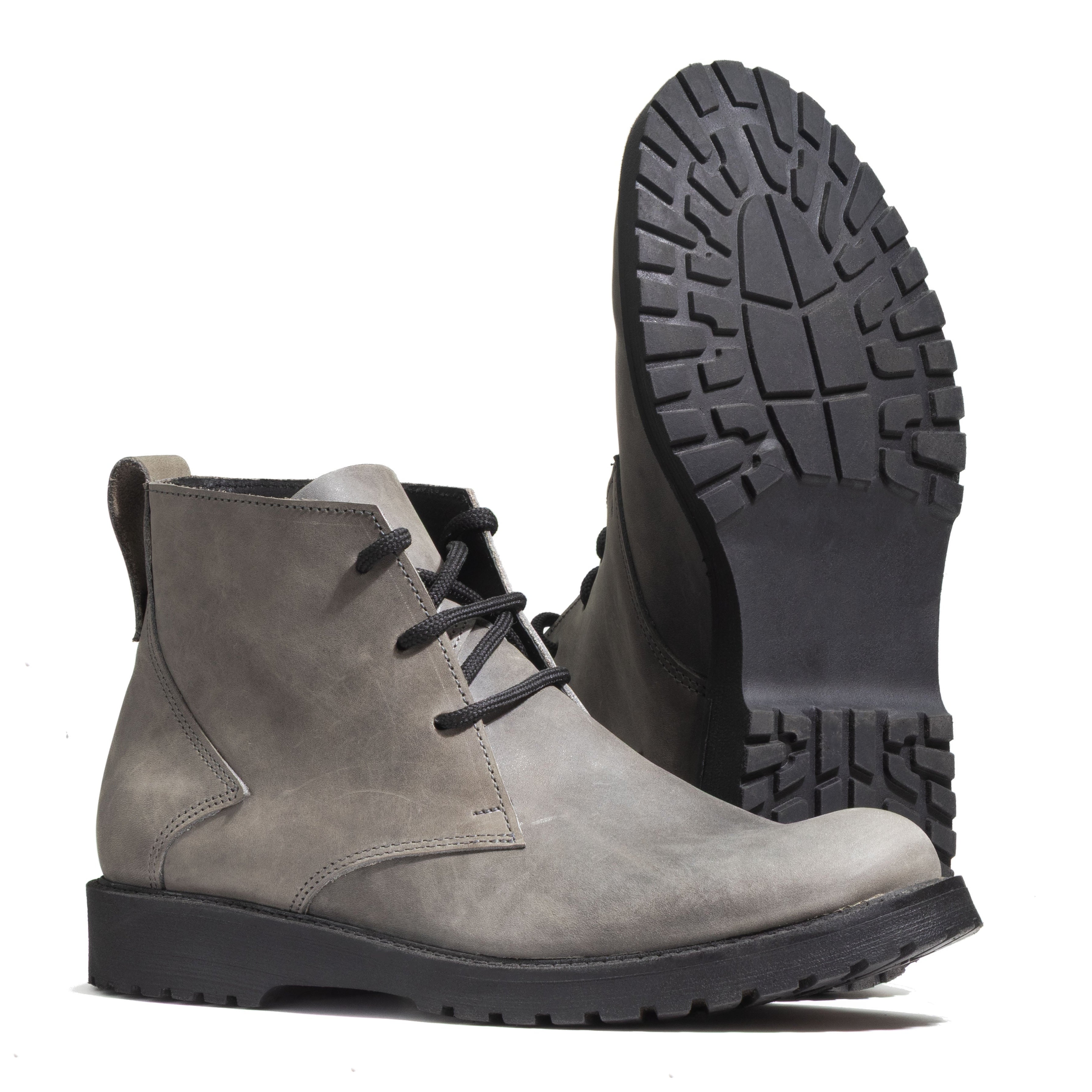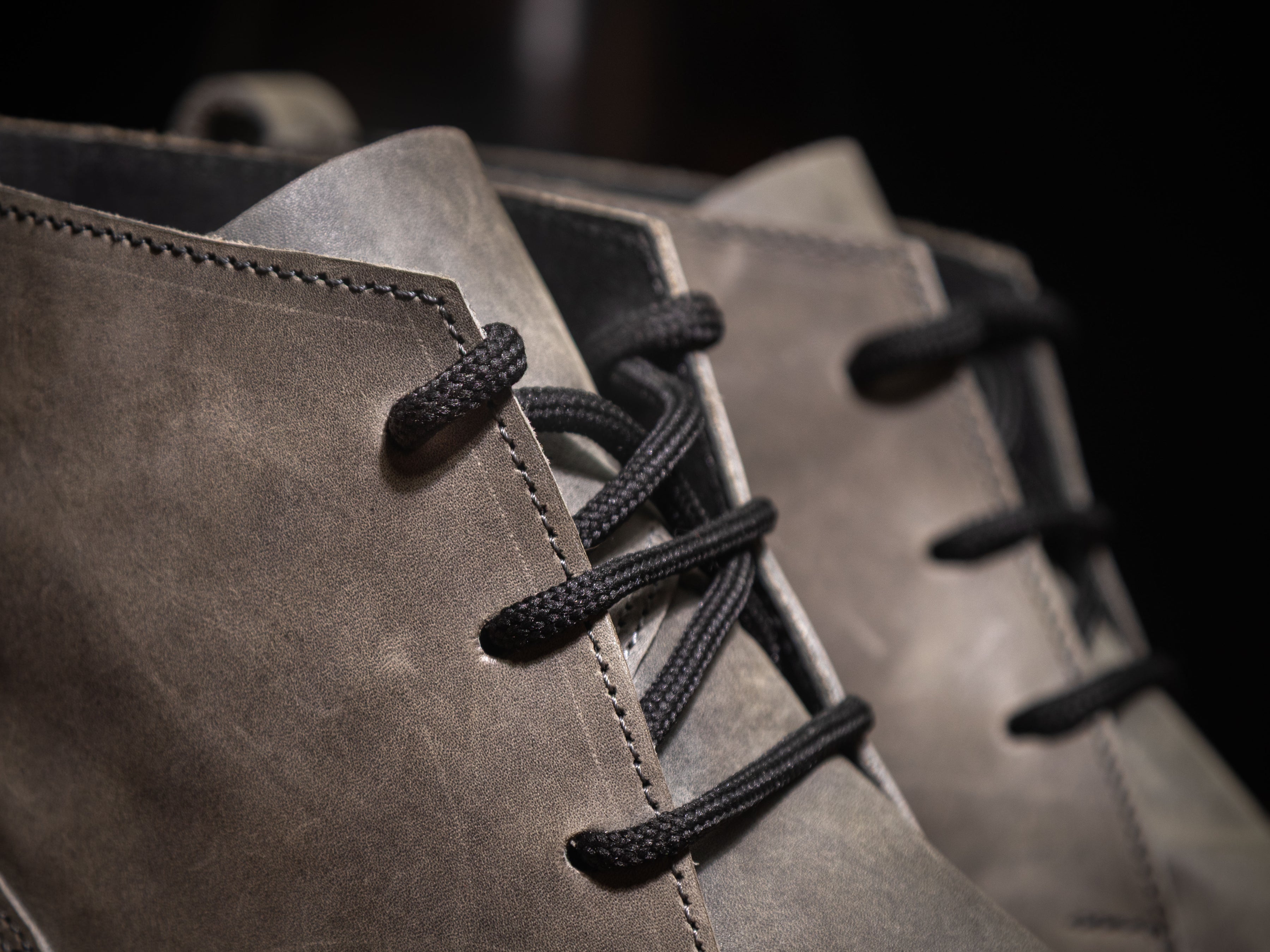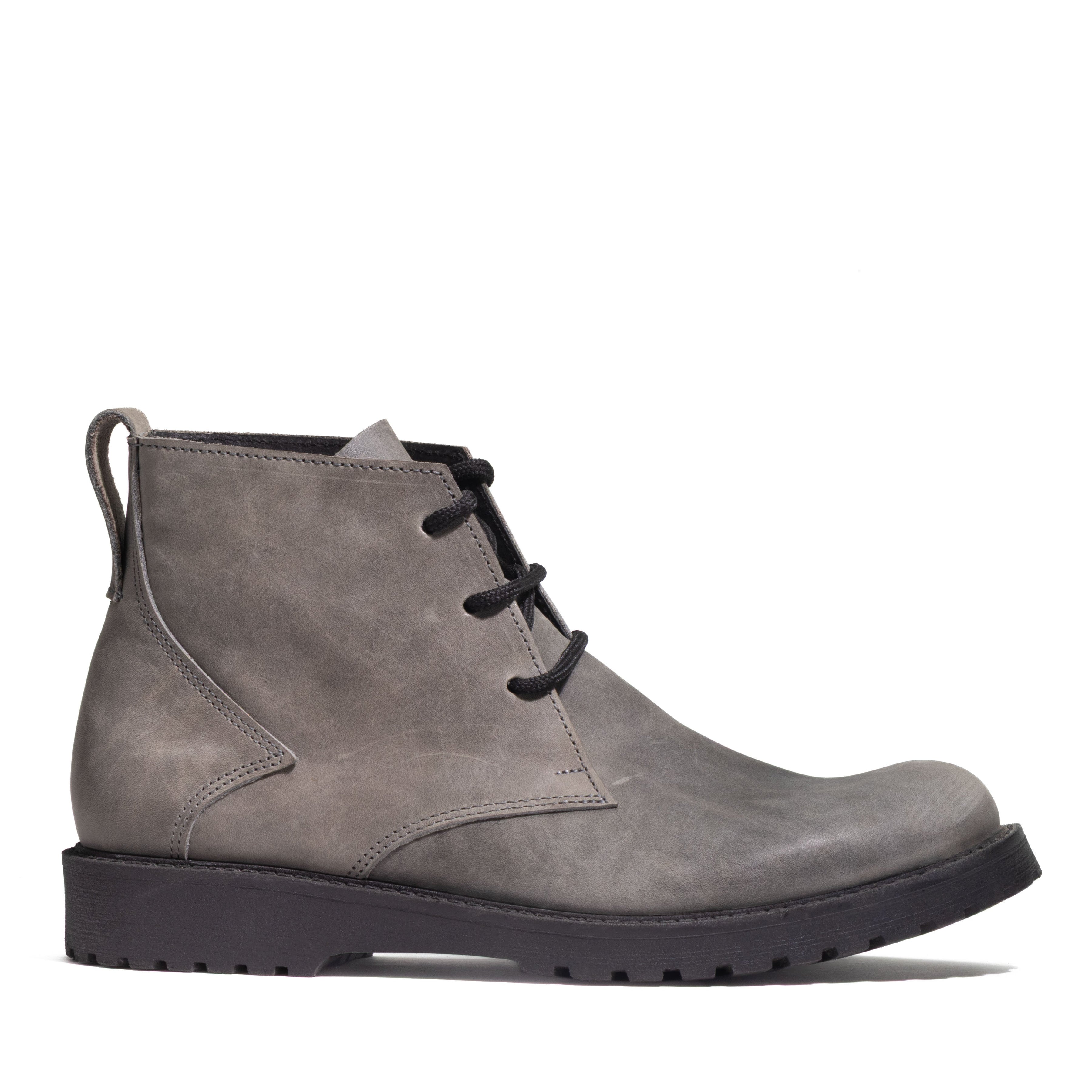 Men’s 5" (13 cm) top-grain leather chukka with a 3-eyelet lace and rear pull loop. Shown here in Pullup Grey. Handmade in Laconia, Greece, delivering comfort, durability, and grip from city streets to weekend wander.