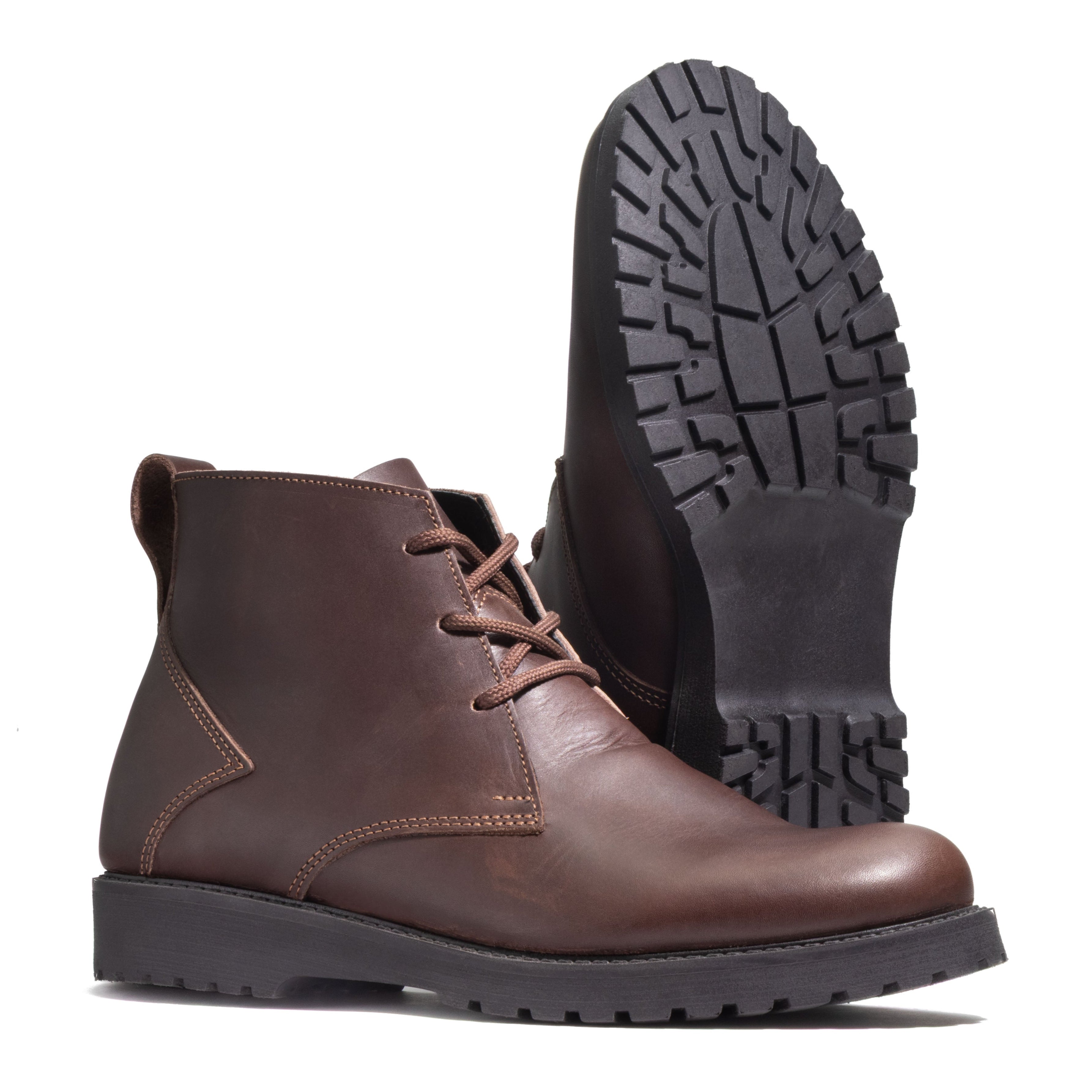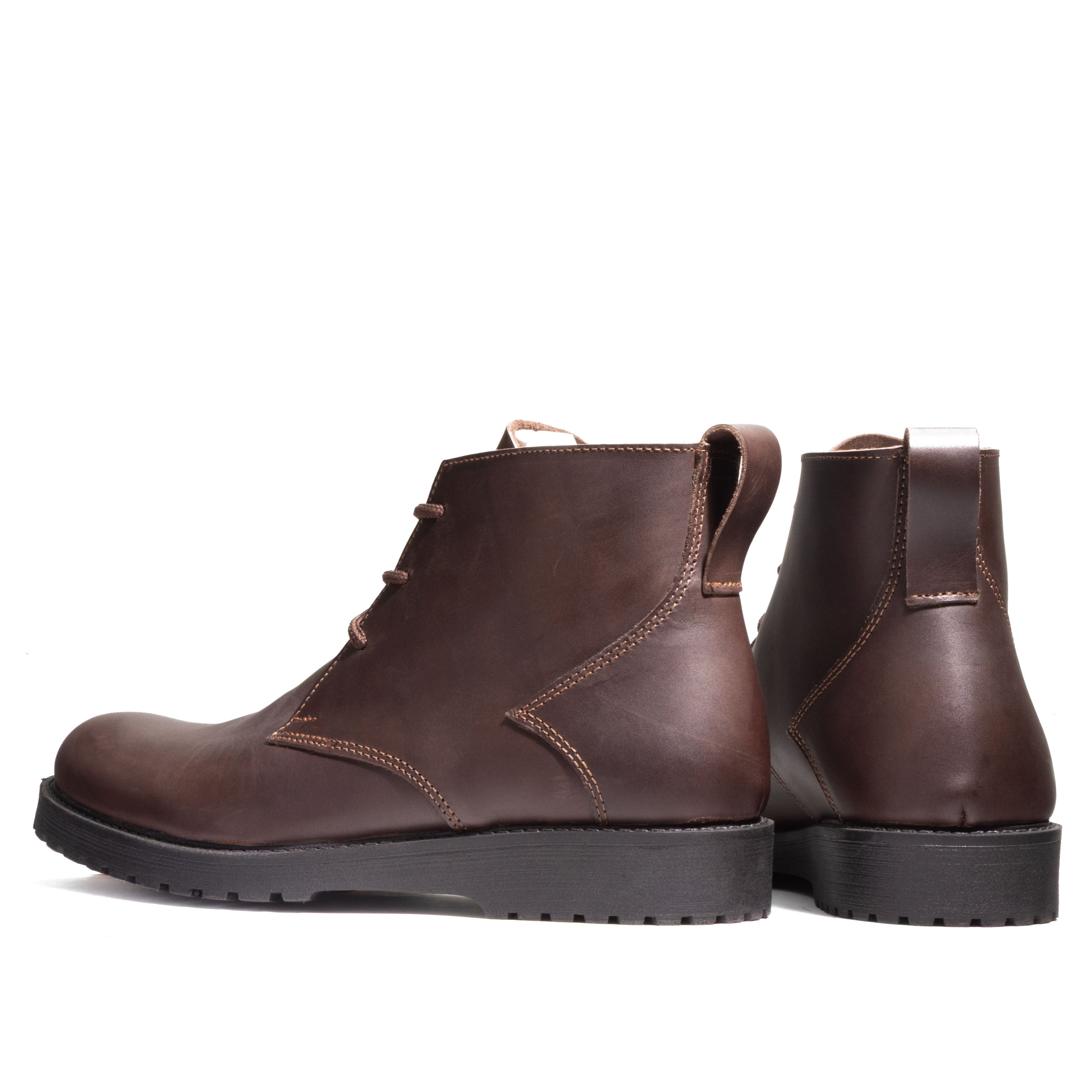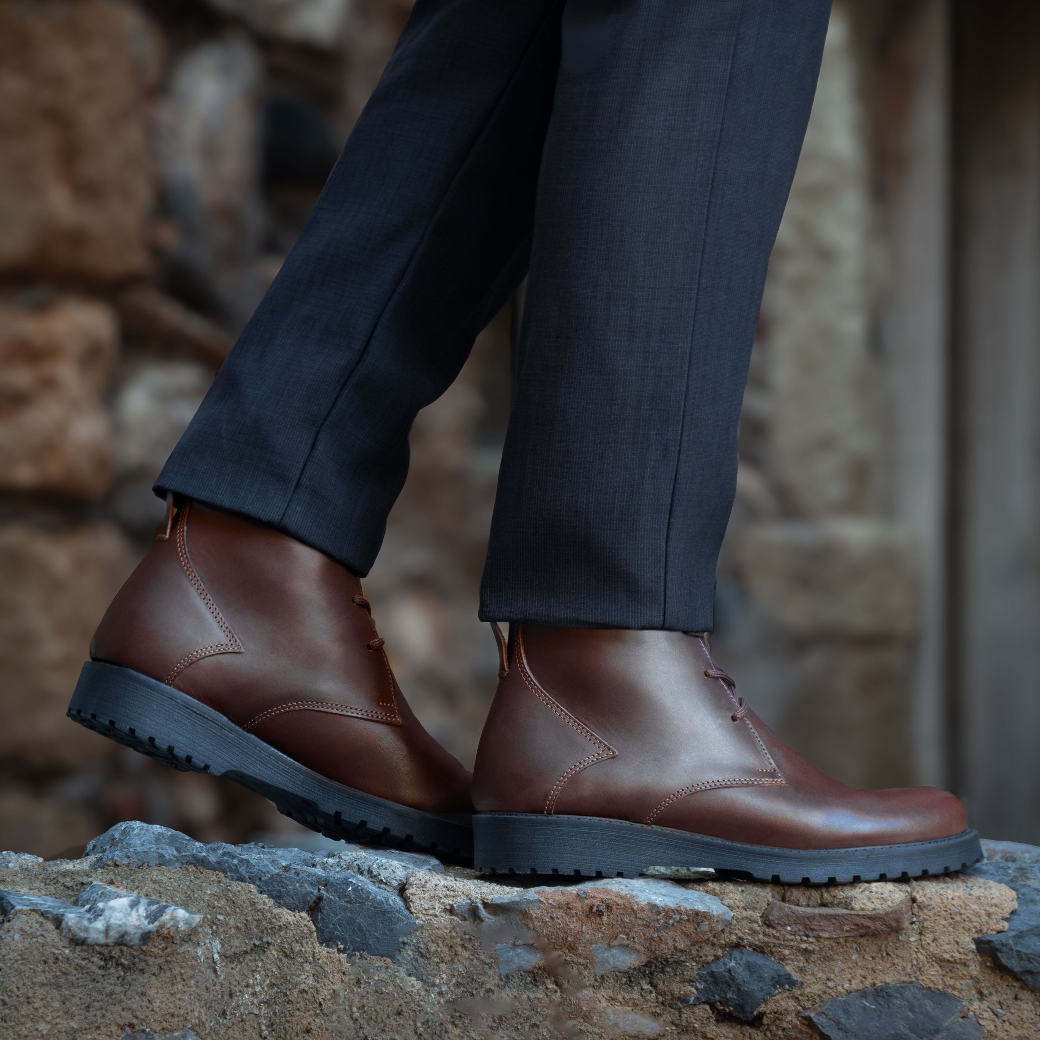 Men’s 5" (13 cm) top-grain leather chukka with a 3-eyelet lace and rear pull loop. Shown here in Waxed Camel. Handmade in Laconia, Greece, delivering comfort, durability, and grip from city streets to weekend wander.