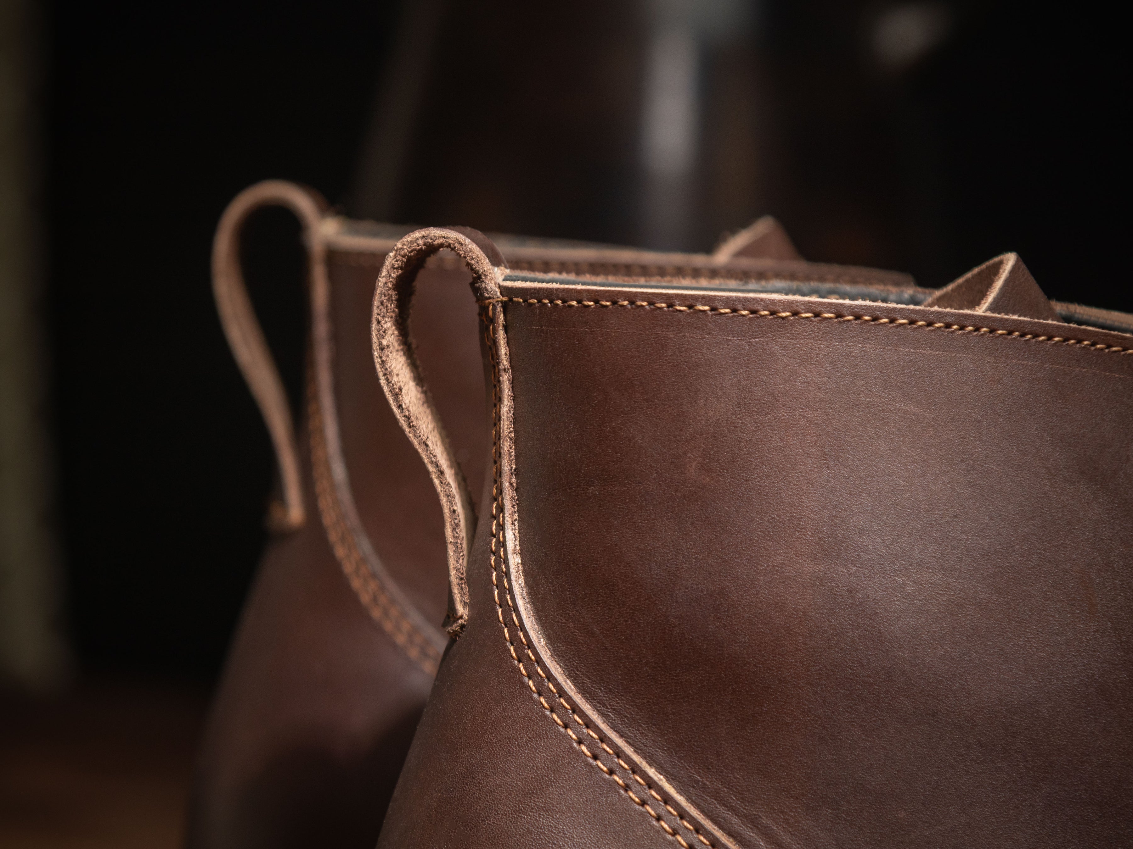 - Two premium sole options — (1) Vibram® full rubber lug, (2) Vibram® dual pad with wooden heel + leather midsole