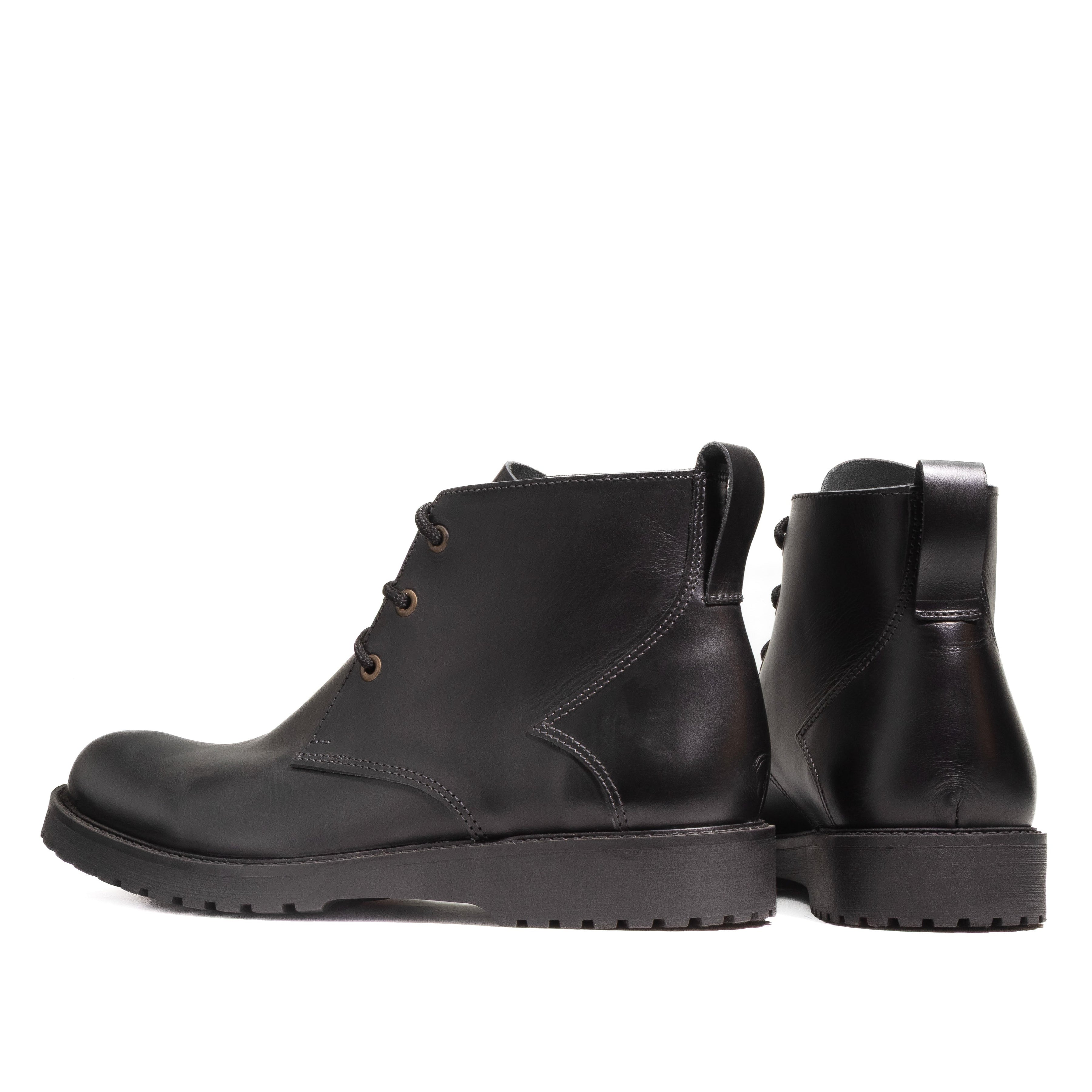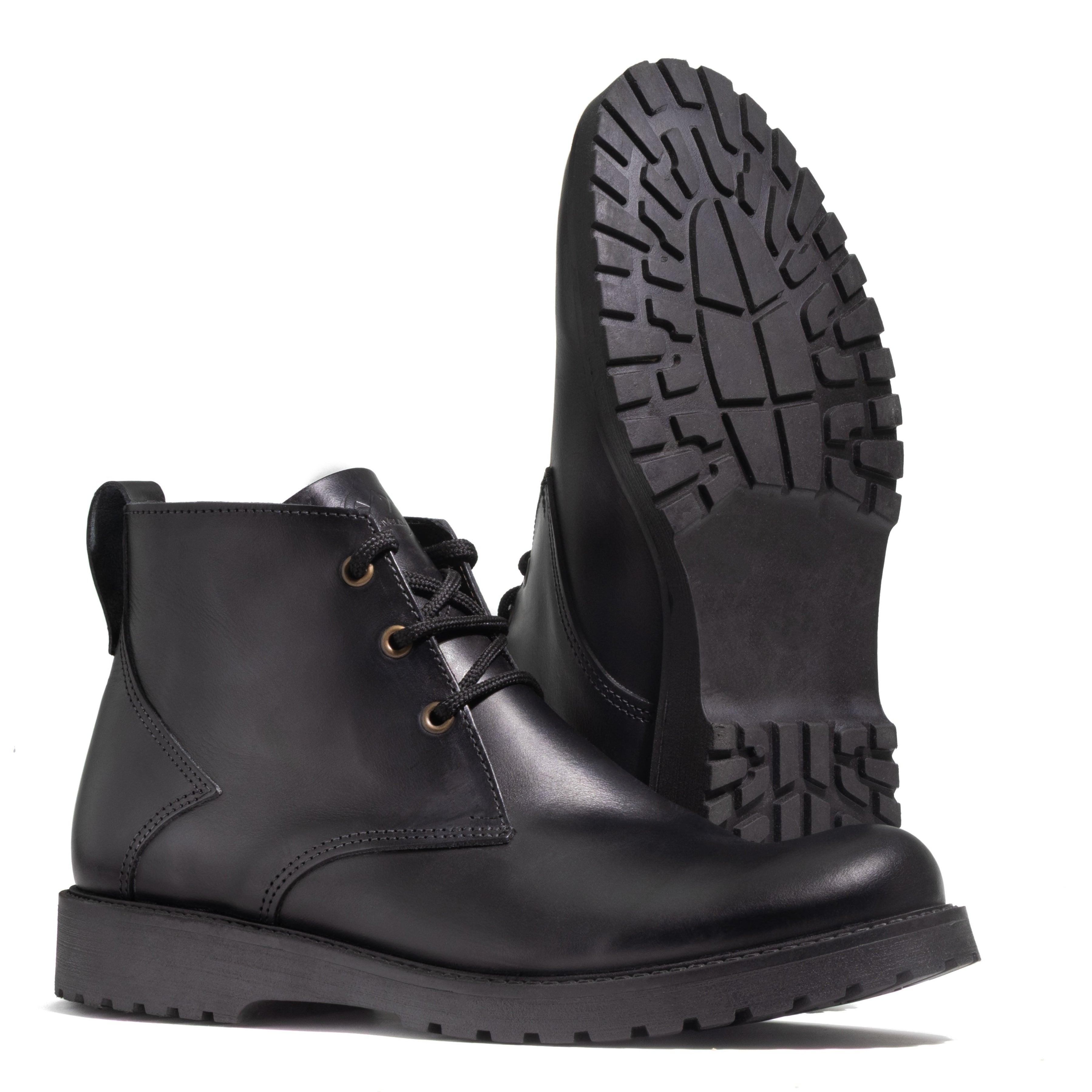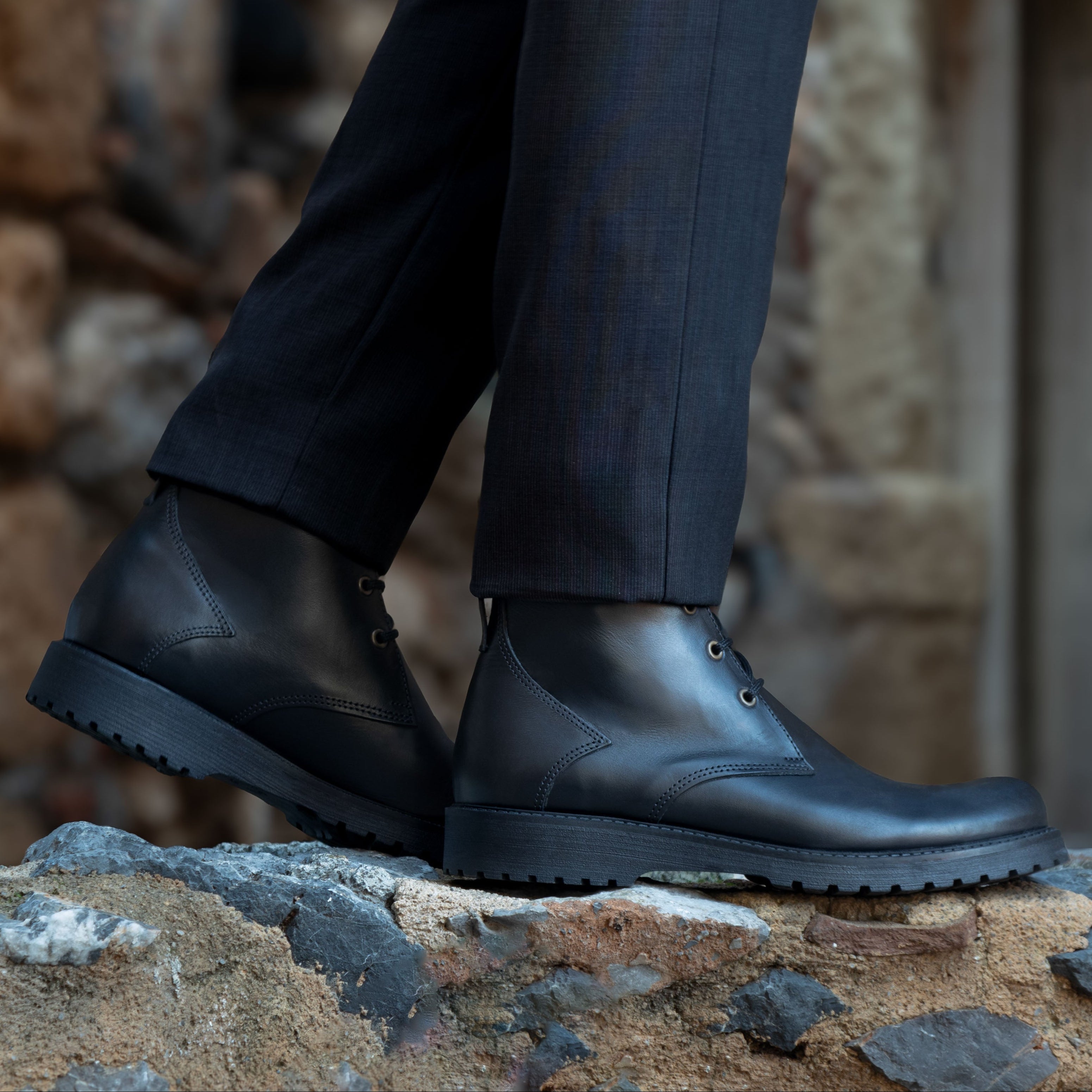 Men’s 5" (13 cm) top-grain leather chukka with a 3-eyelet lace and rear pull loop. Shown here in Satin Black. Handmade in Laconia, Greece, delivering comfort, durability, and grip from city streets to weekend wander.