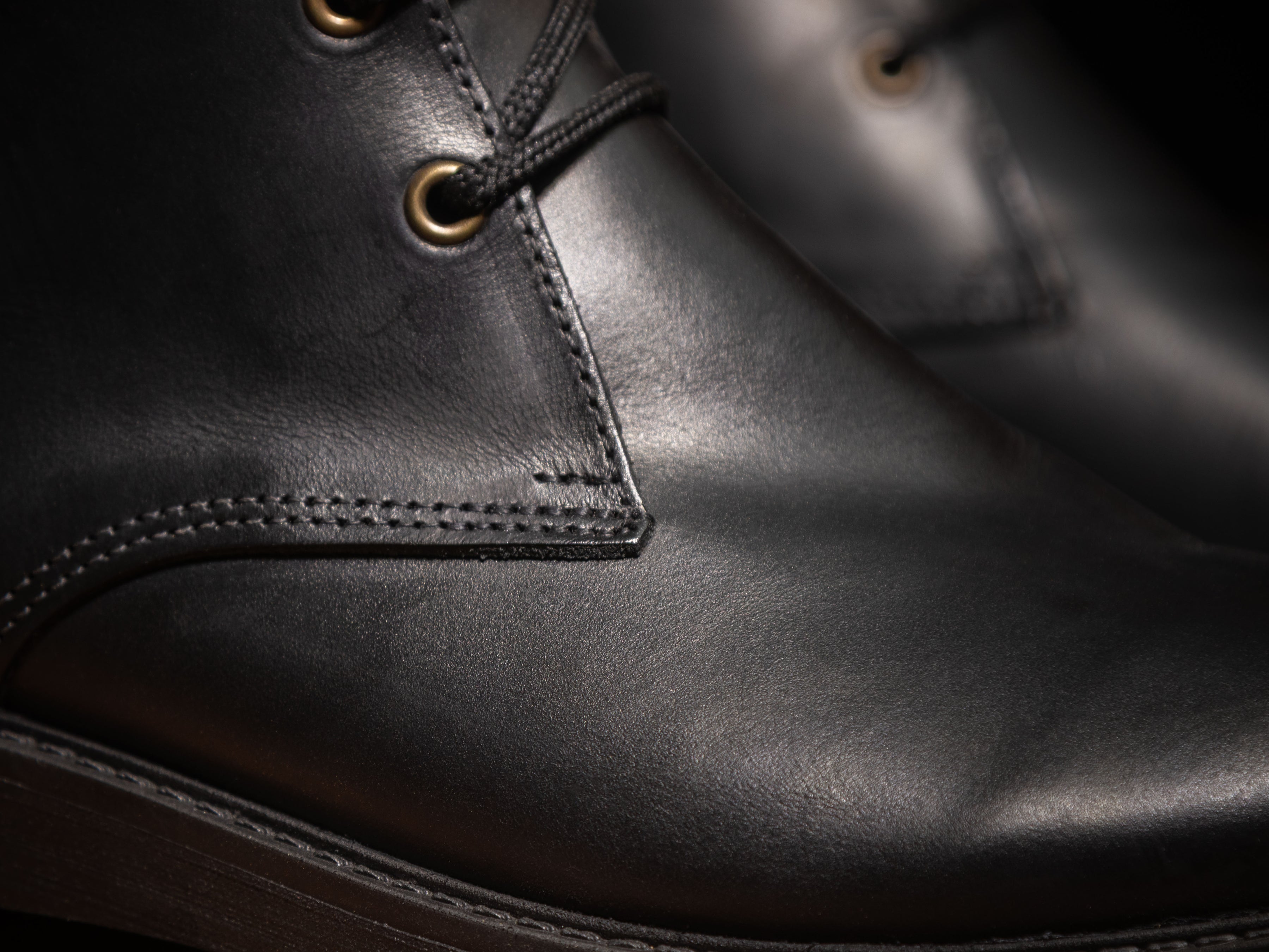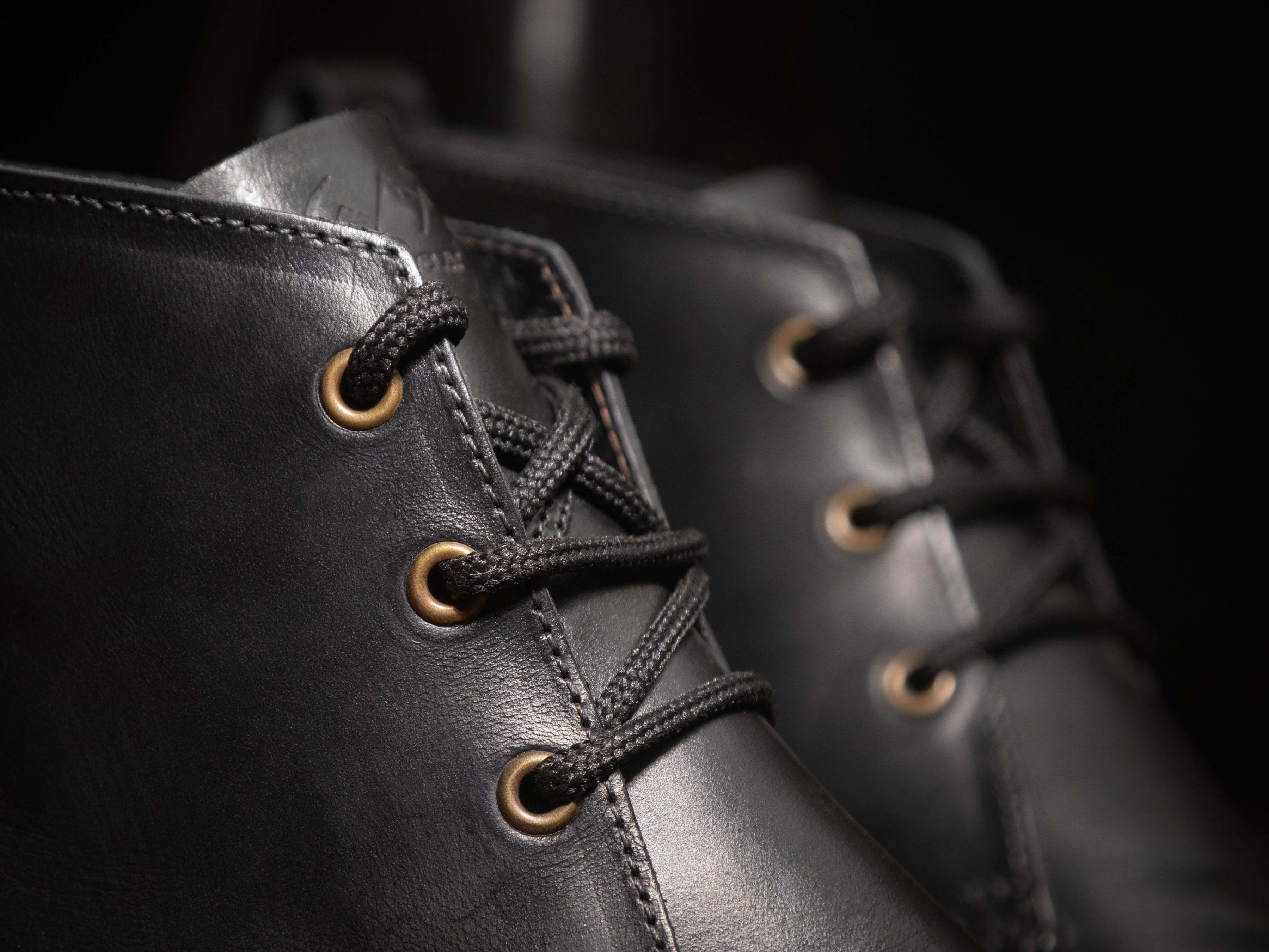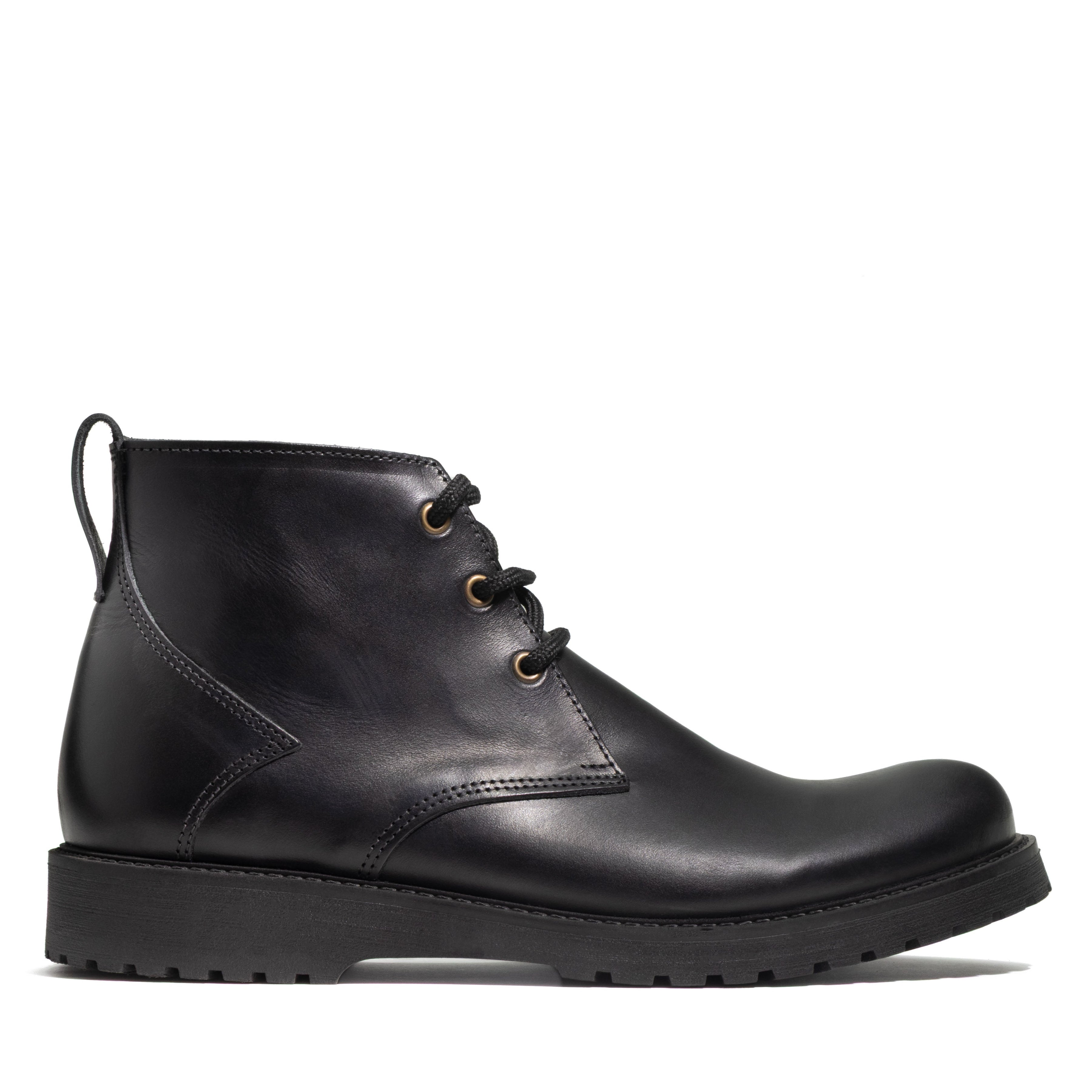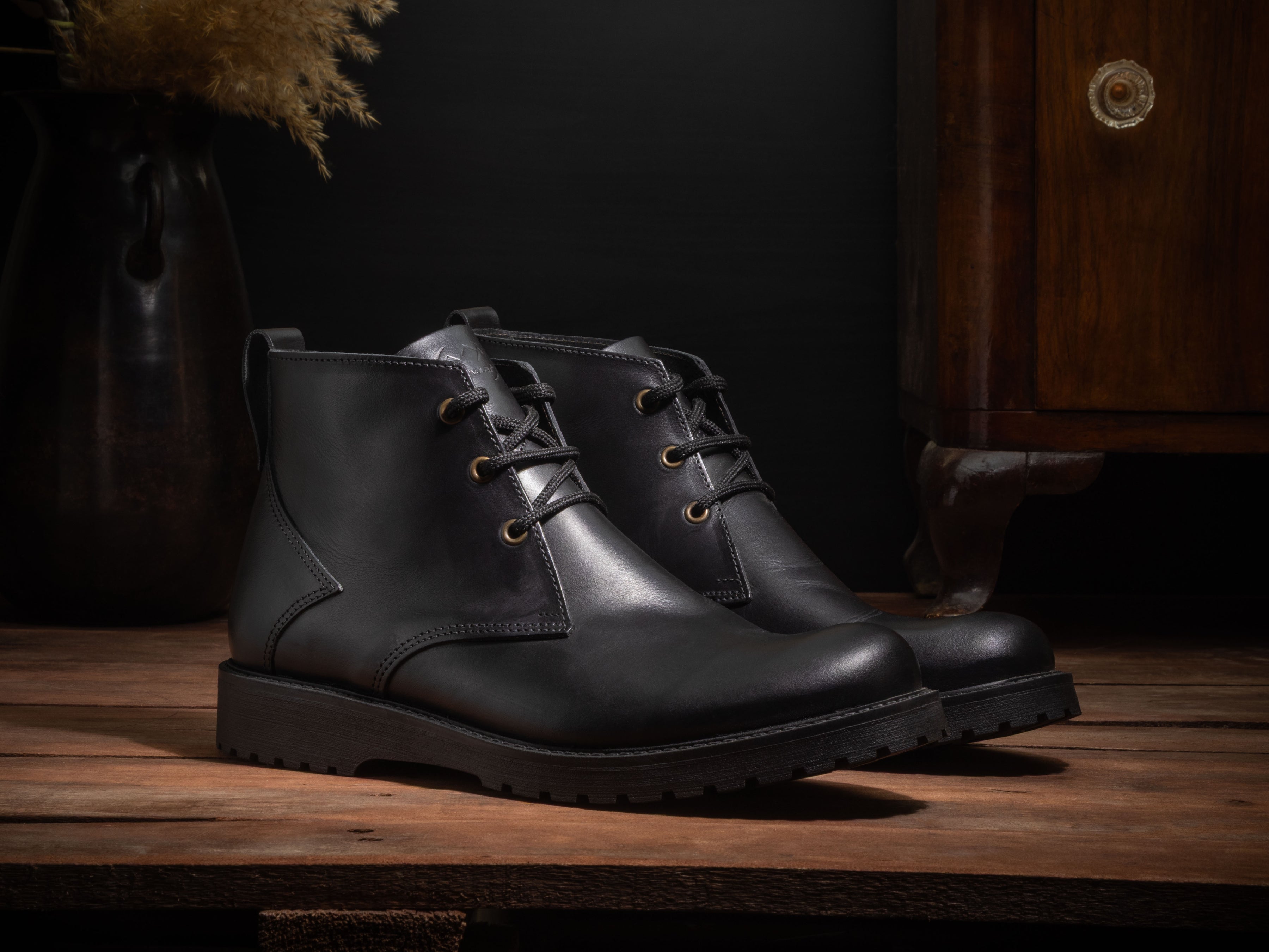 Men’s 5" (13 cm) top-grain leather chukka with a 3-eyelet lace and rear pull loop. Shown here in Satin Black. Handmade in Laconia, Greece, delivering comfort, durability, and grip from city streets to weekend wander.