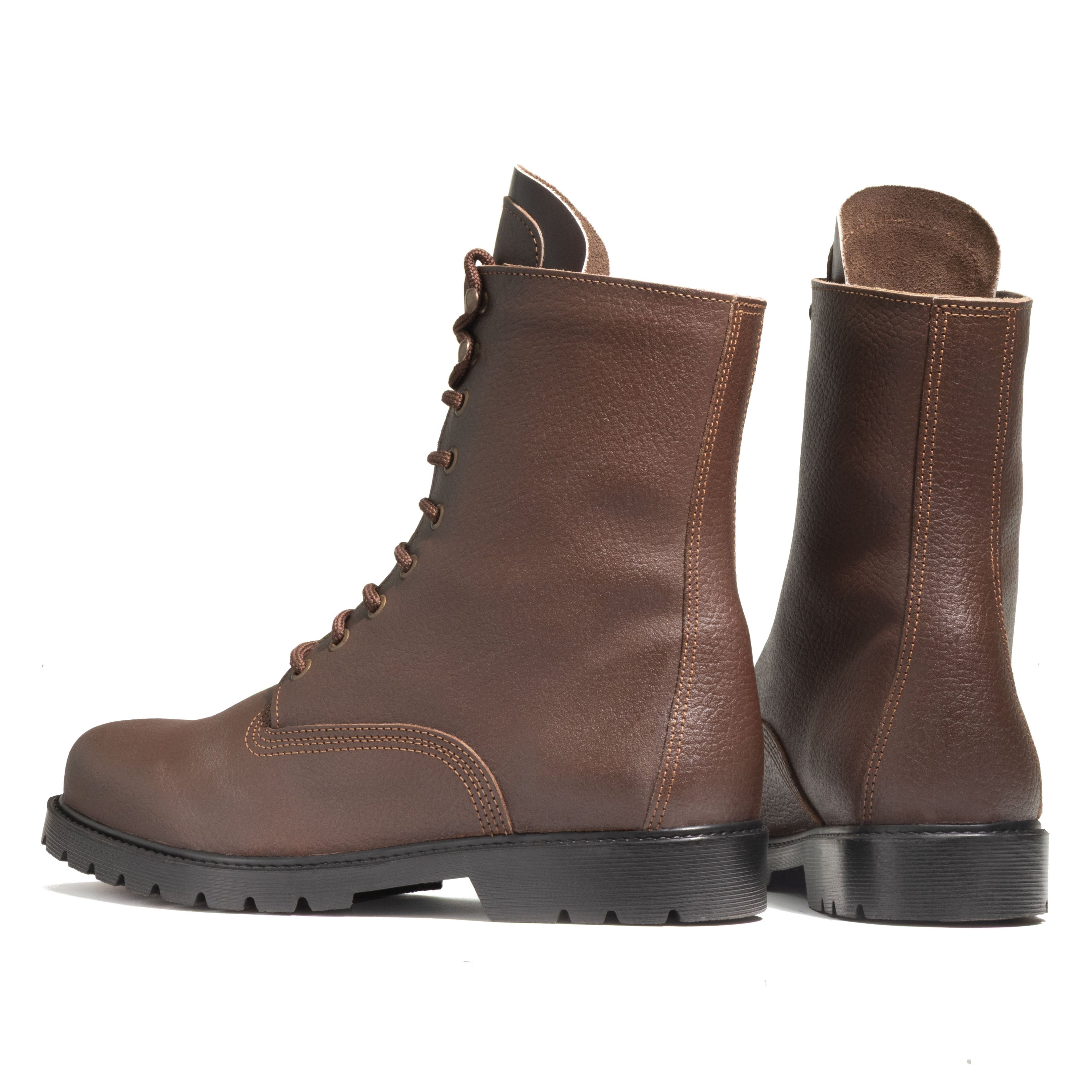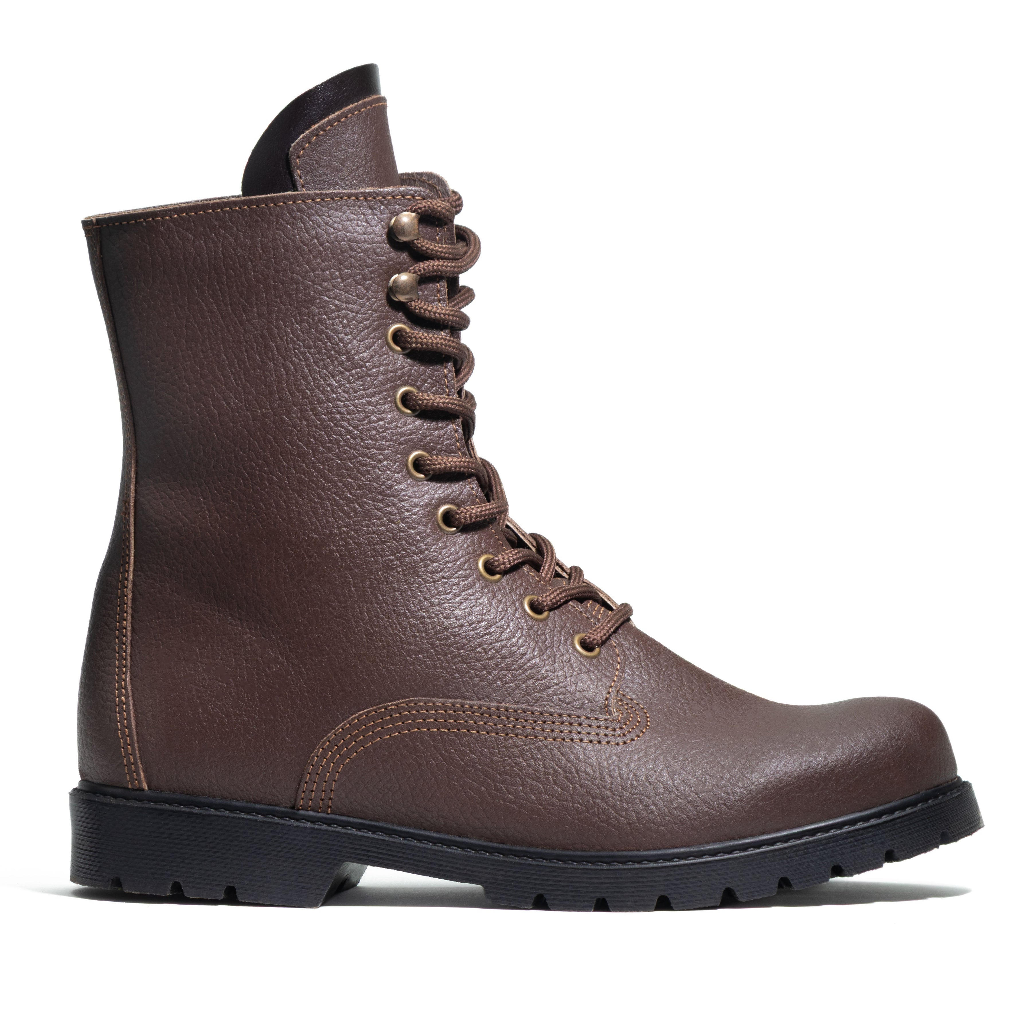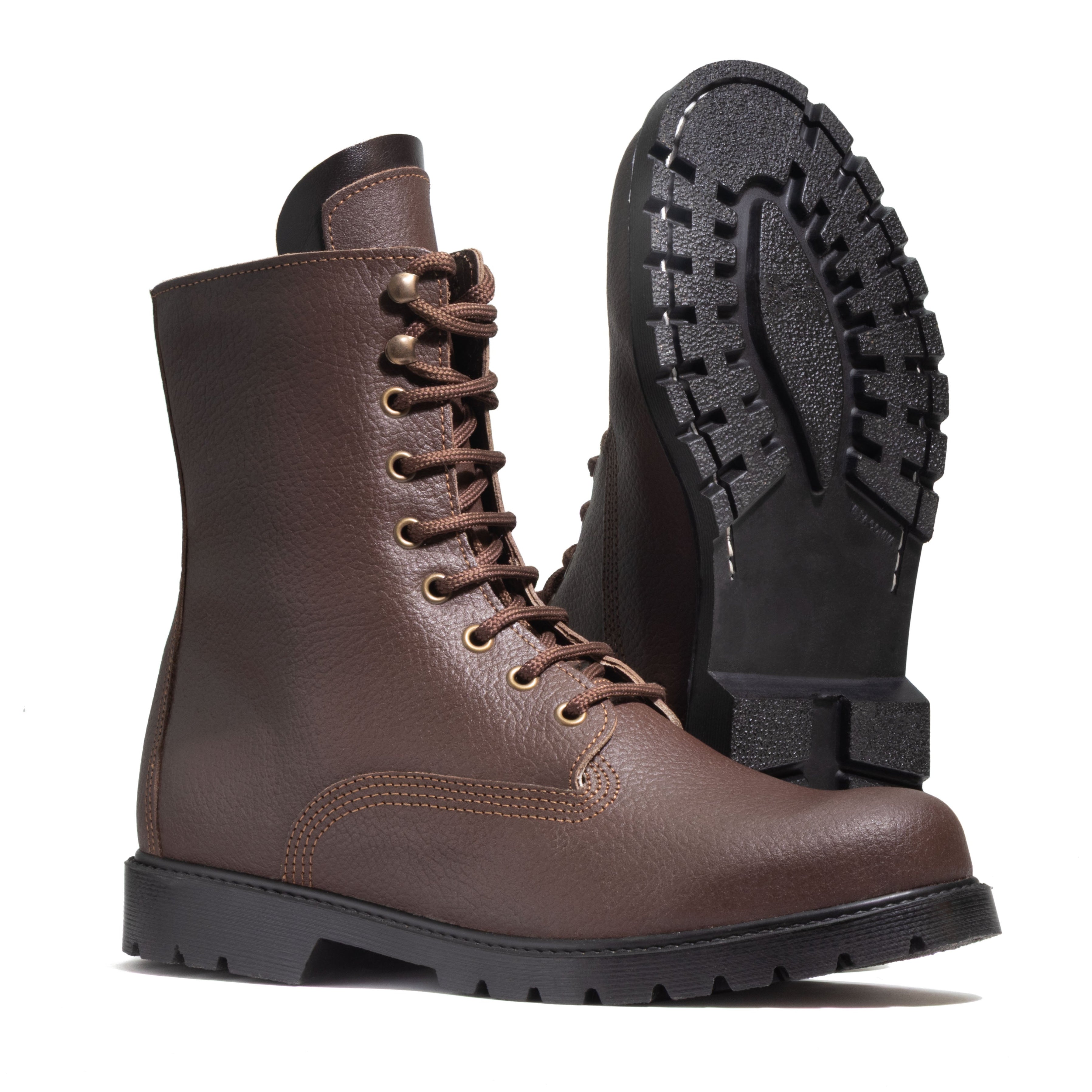 Men’s 10" (25 cm) top-grain leather combat boots with 9 eyelets and a tough, scratch-resistant pebbled leather. Shown here in Pebbled Brown. Handmade and tested in the mountains of Laconia, Greece, delivering durability, support, and grip from winter streets to rugged trails.