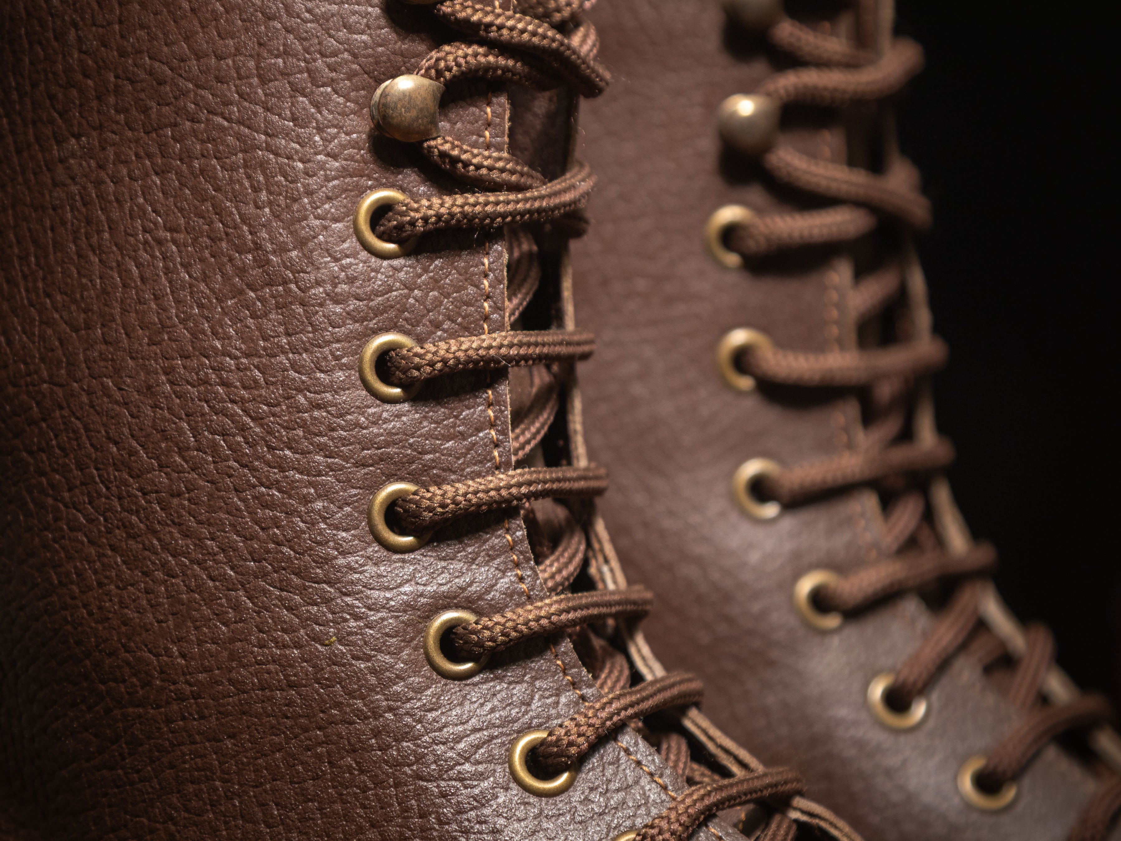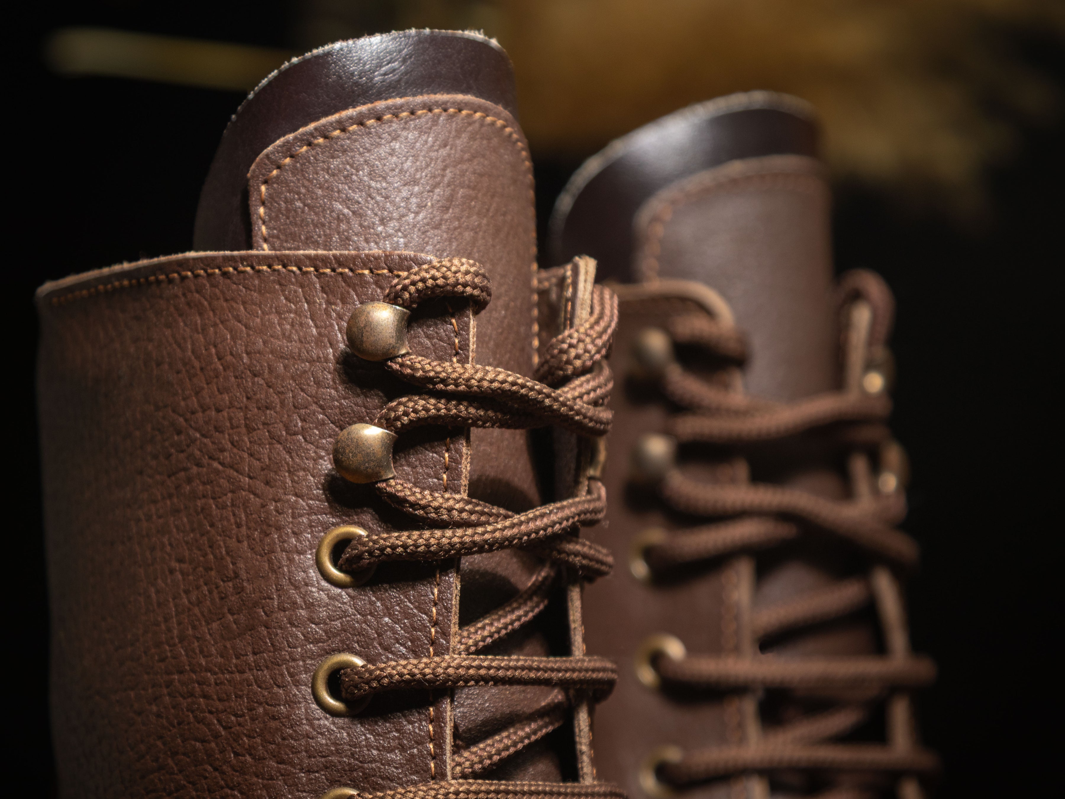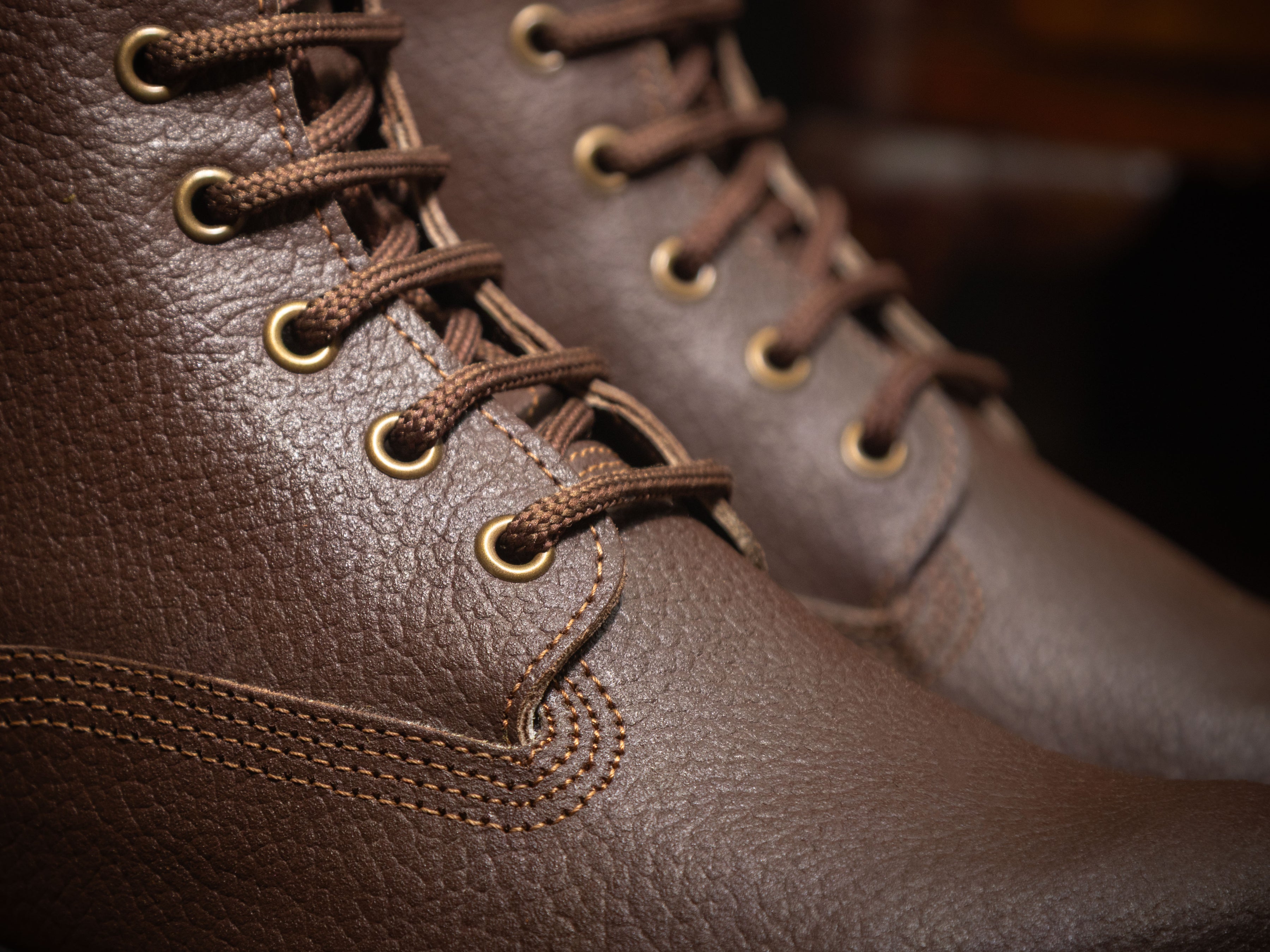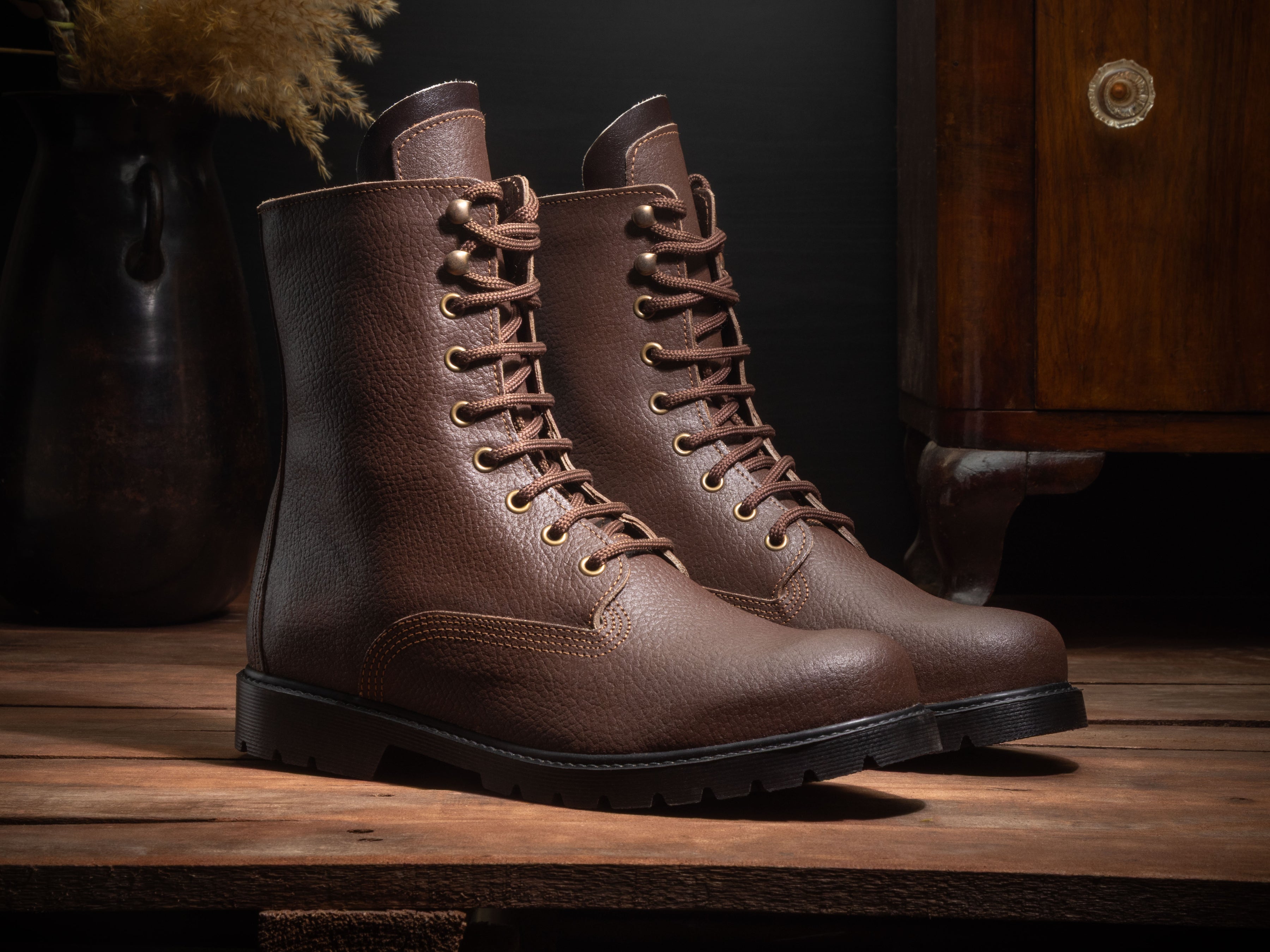 Men’s 10" (25 cm) top-grain leather combat boots with 9 eyelets and a tough, scratch-resistant pebbled leather. Shown here in Pebbled Brown. Handmade and tested in the mountains of Laconia, Greece, delivering durability, support, and grip from winter streets to rugged trails.