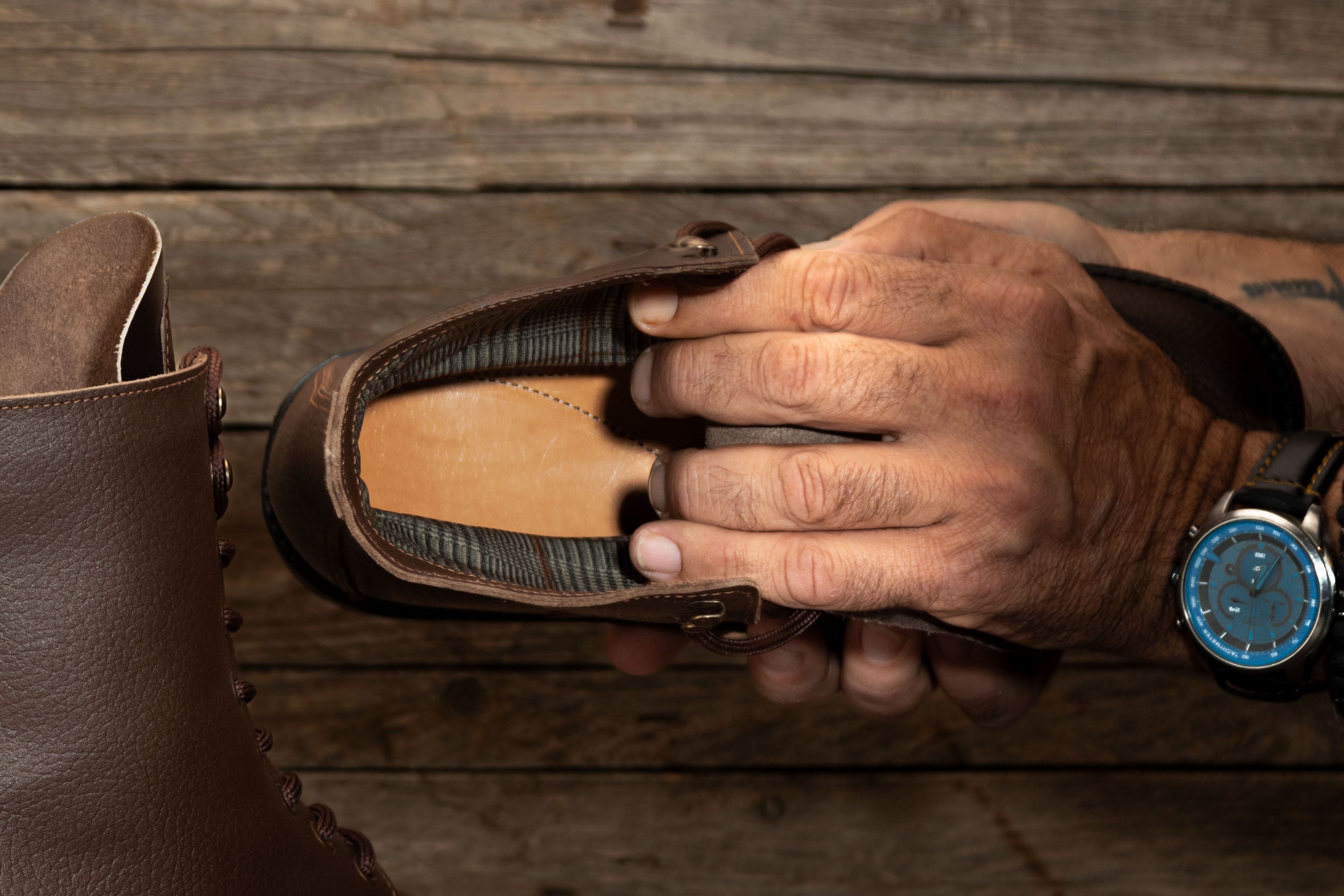 - Two premium sole options — (1) Vibram® full rubber lug, (2) Vibram® dual pad with wooden heel + leather midsole