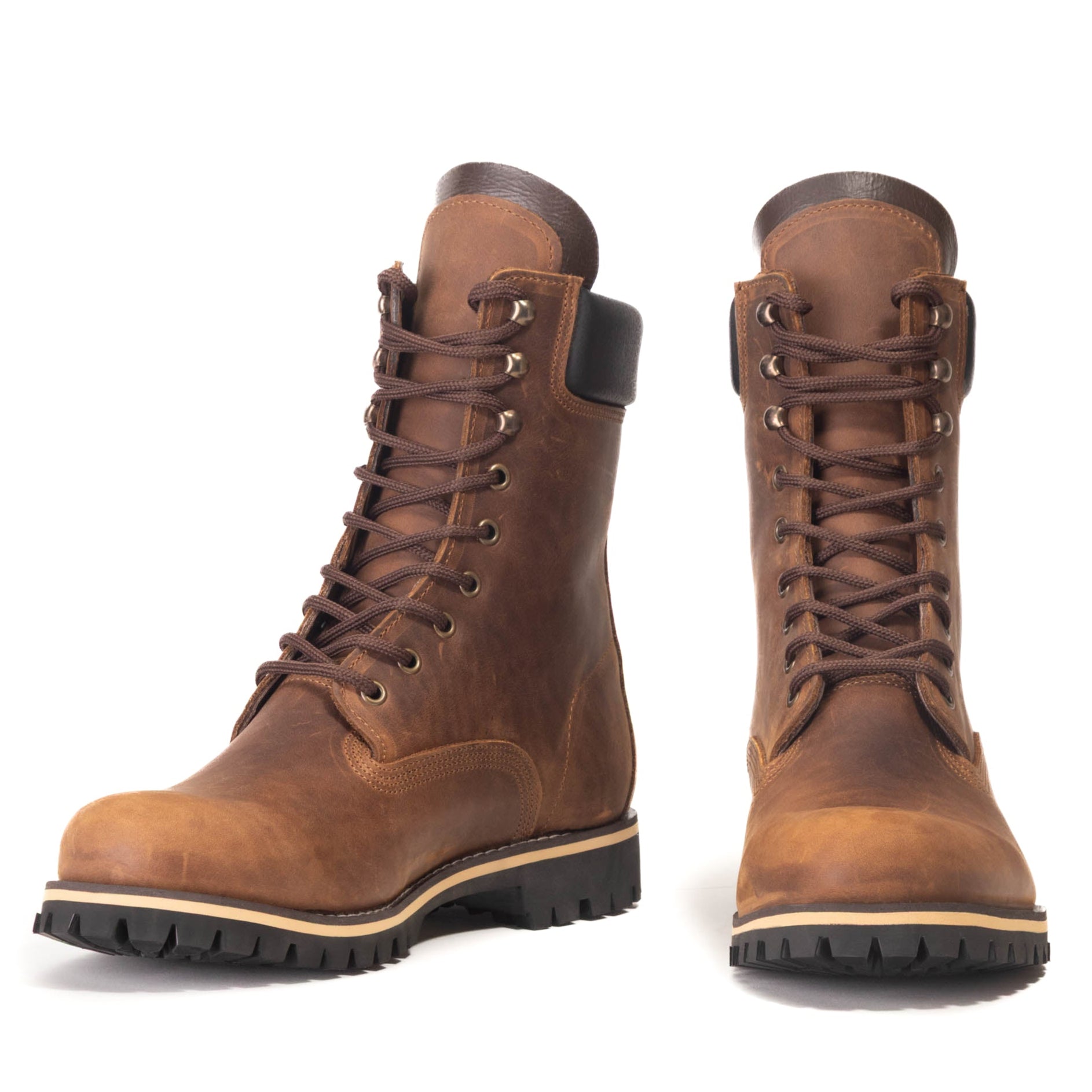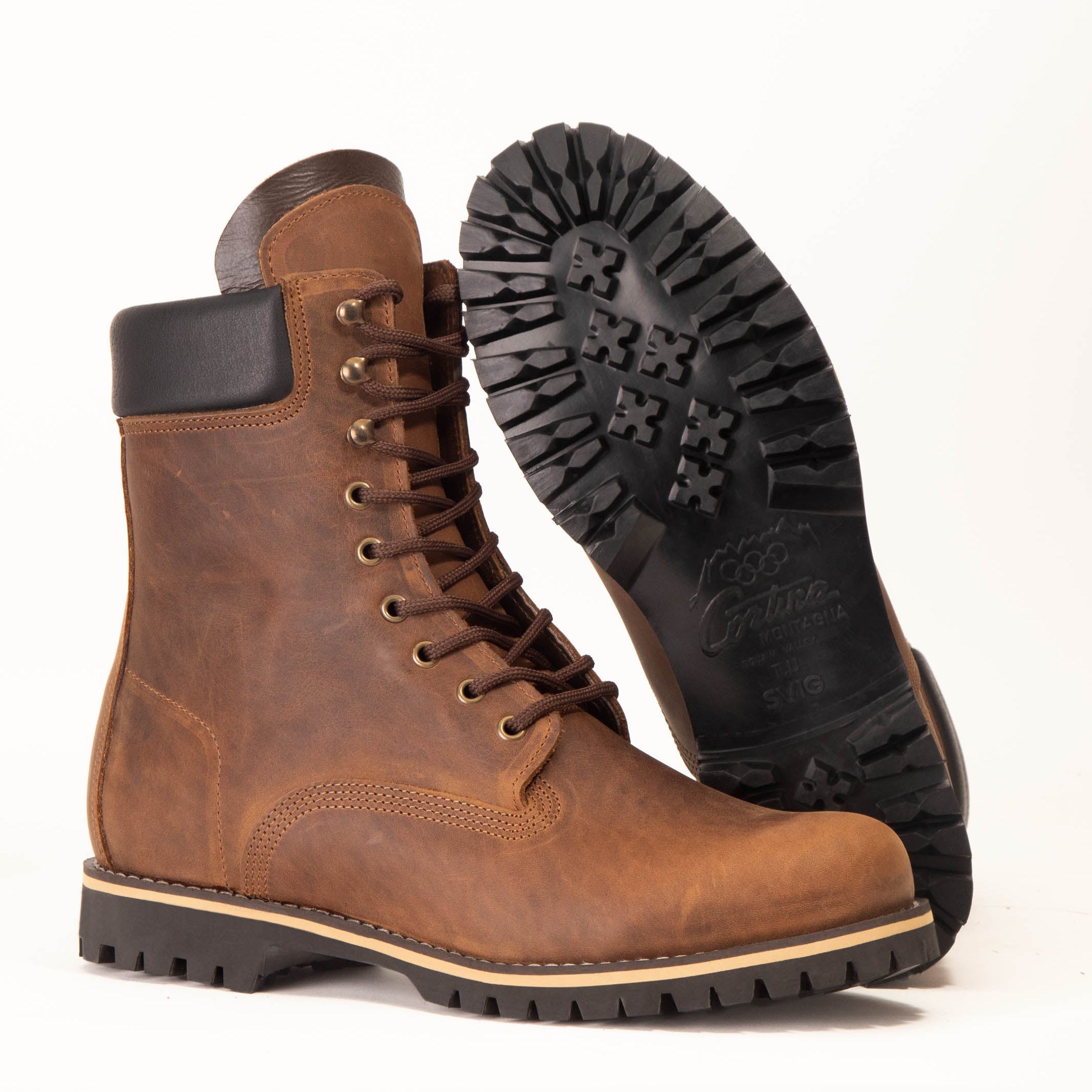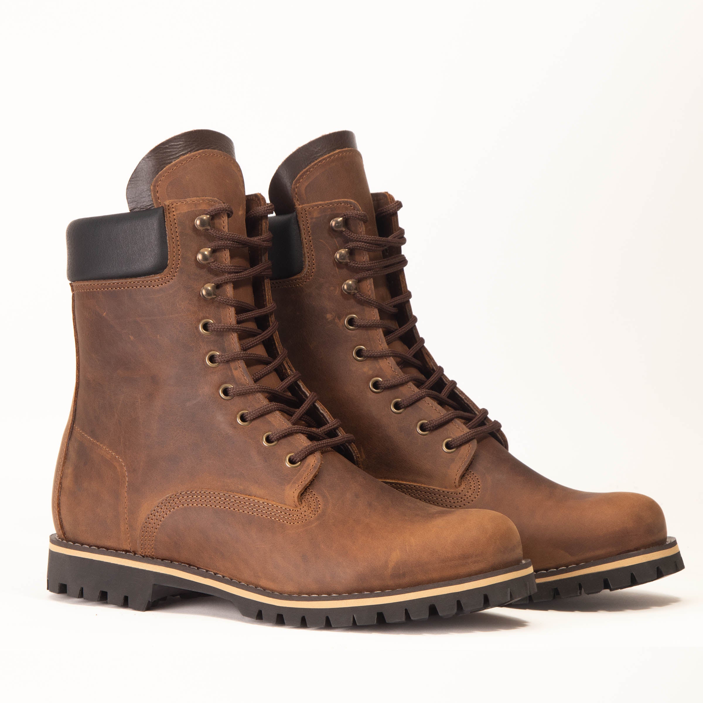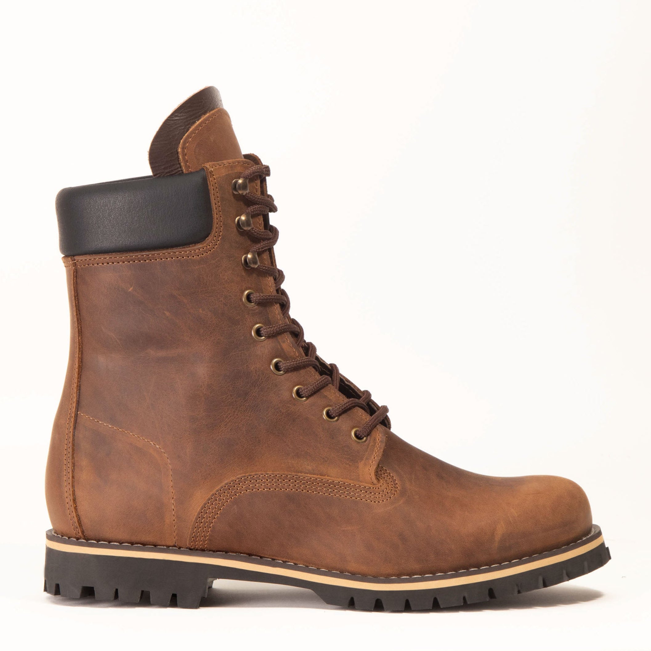 Men’s 10" (25 cm) top-grain leather lace-ups with quad stitching and a cushioned cuff for stability and comfort. Shown here in Rustic Brown. Handmade and tested in the rugged mountains of Laconia, Greece, delivering durability, support, and grip across city and trail.
