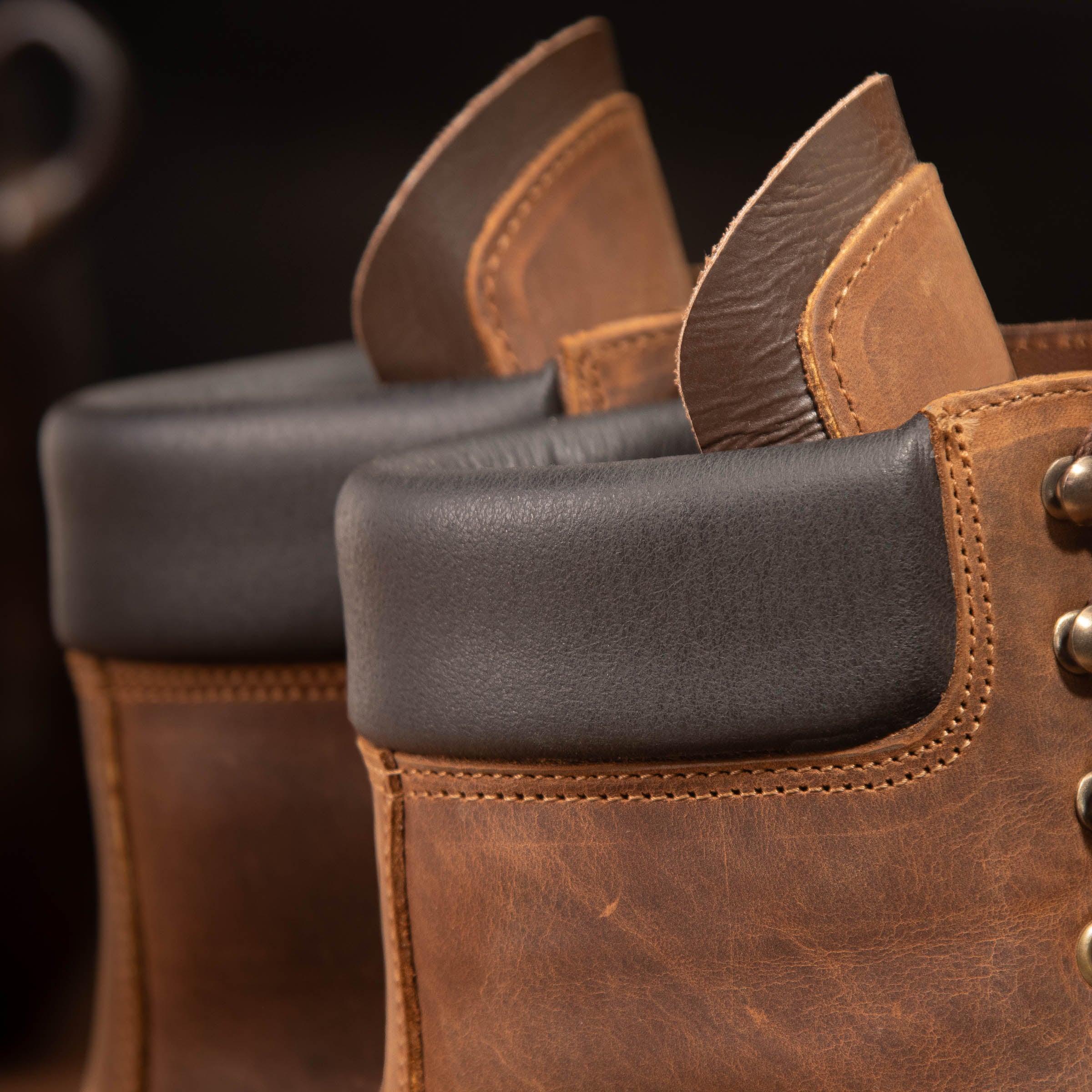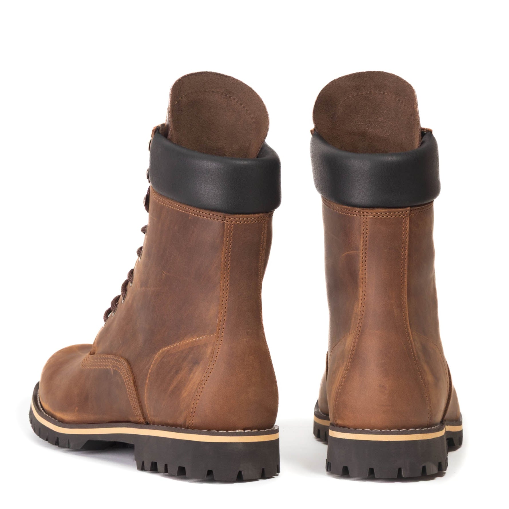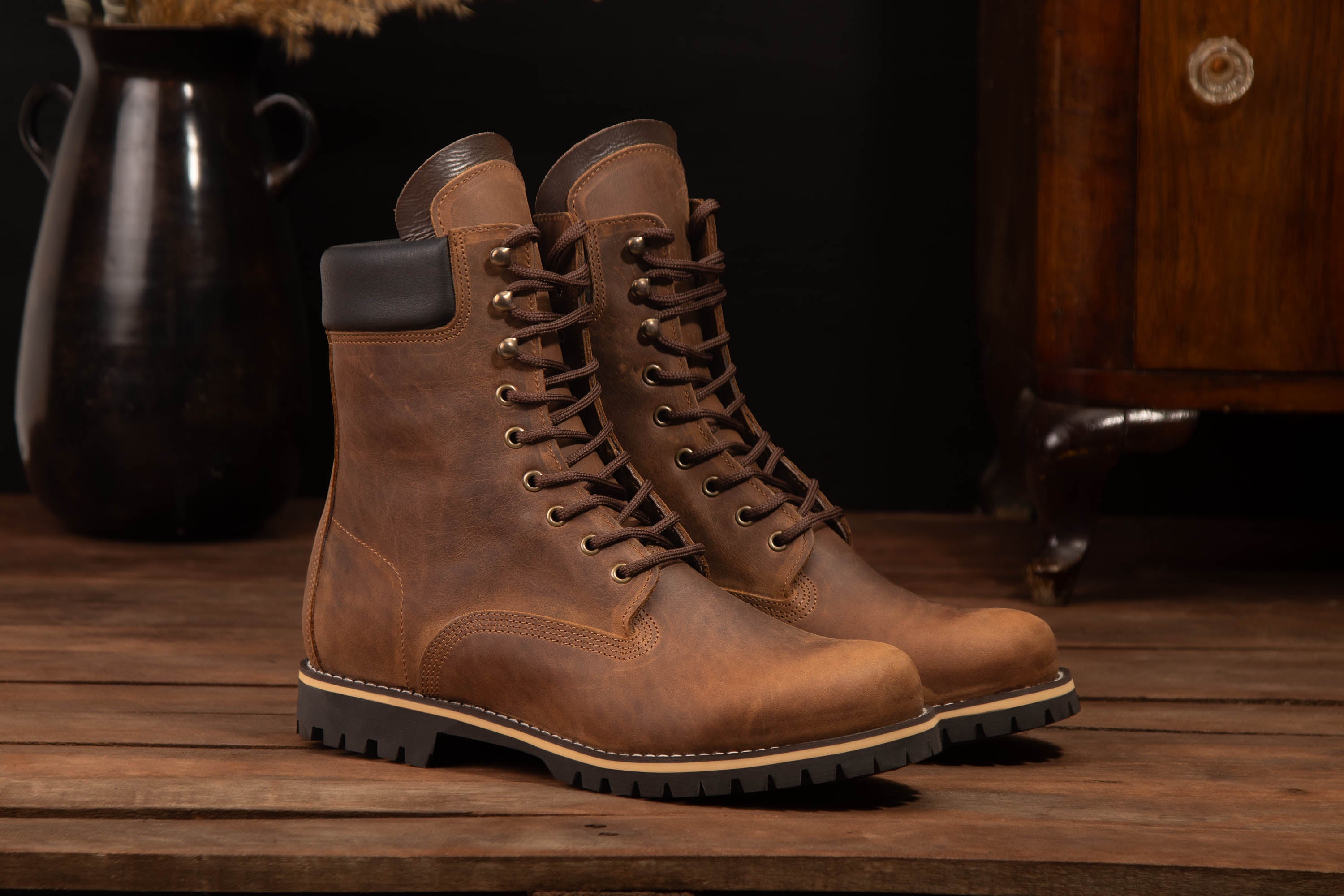 - Two premium sole options — (1) Vibram® full rubber lug, (2) Vibram® dual pad with wooden heel + leather midsole