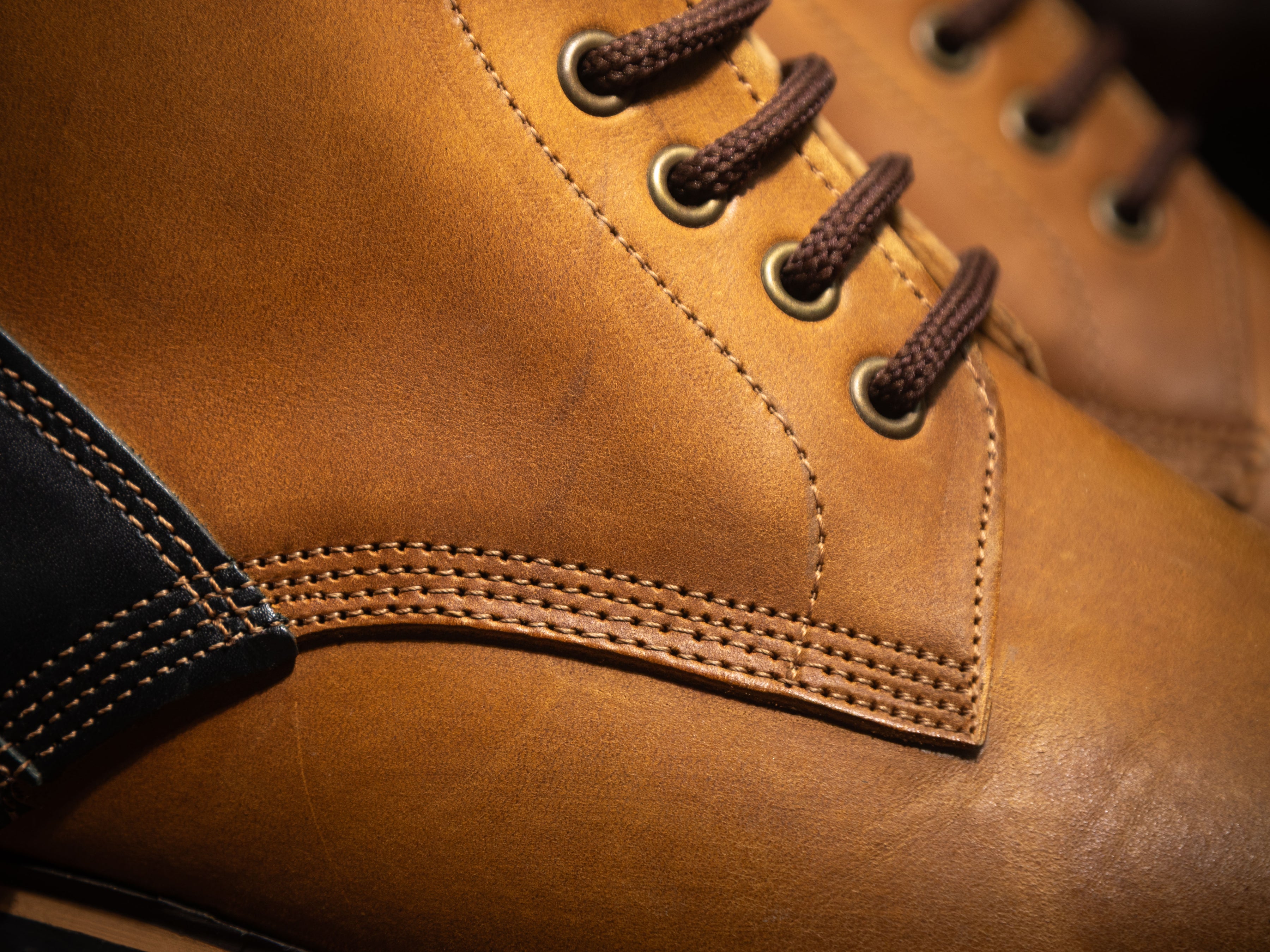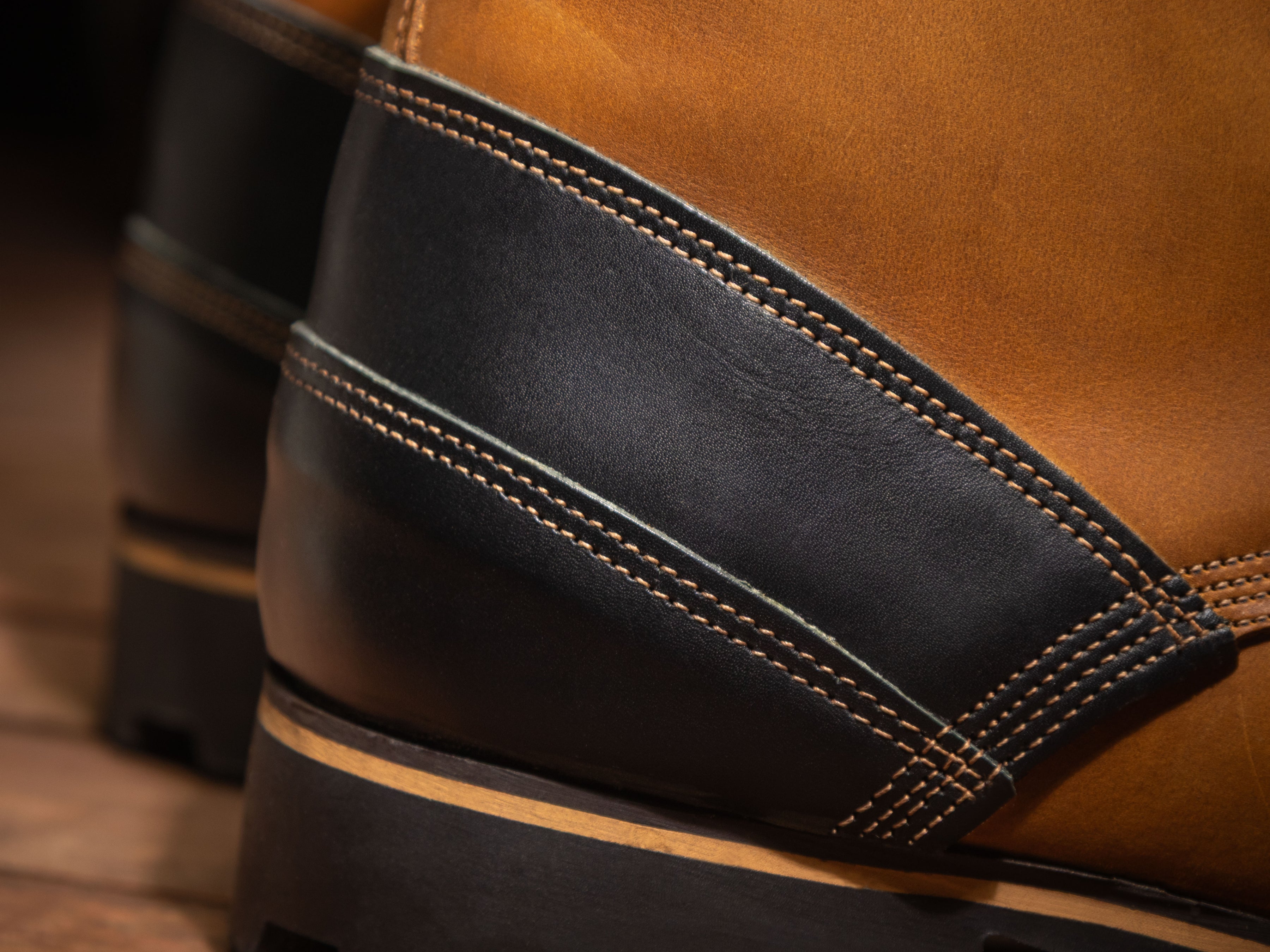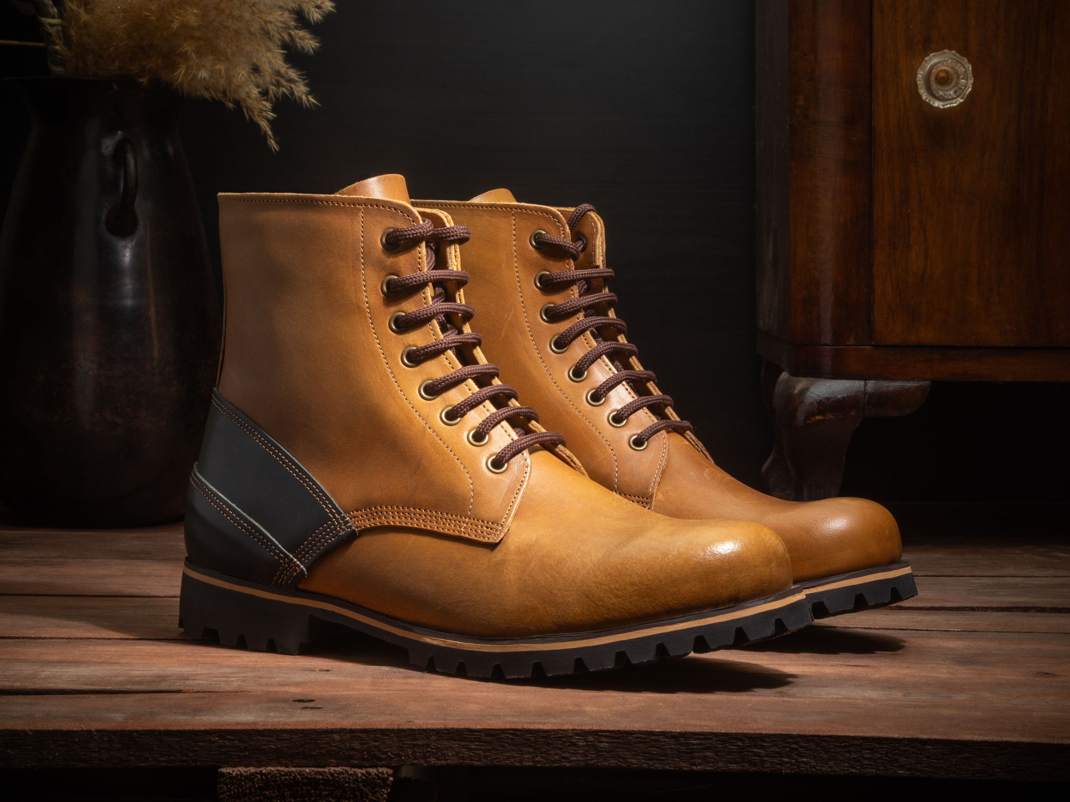- Two premium sole options — (1) Vibram® full rubber lug, (2) Vibram® dual pad with wooden heel + leather midsole