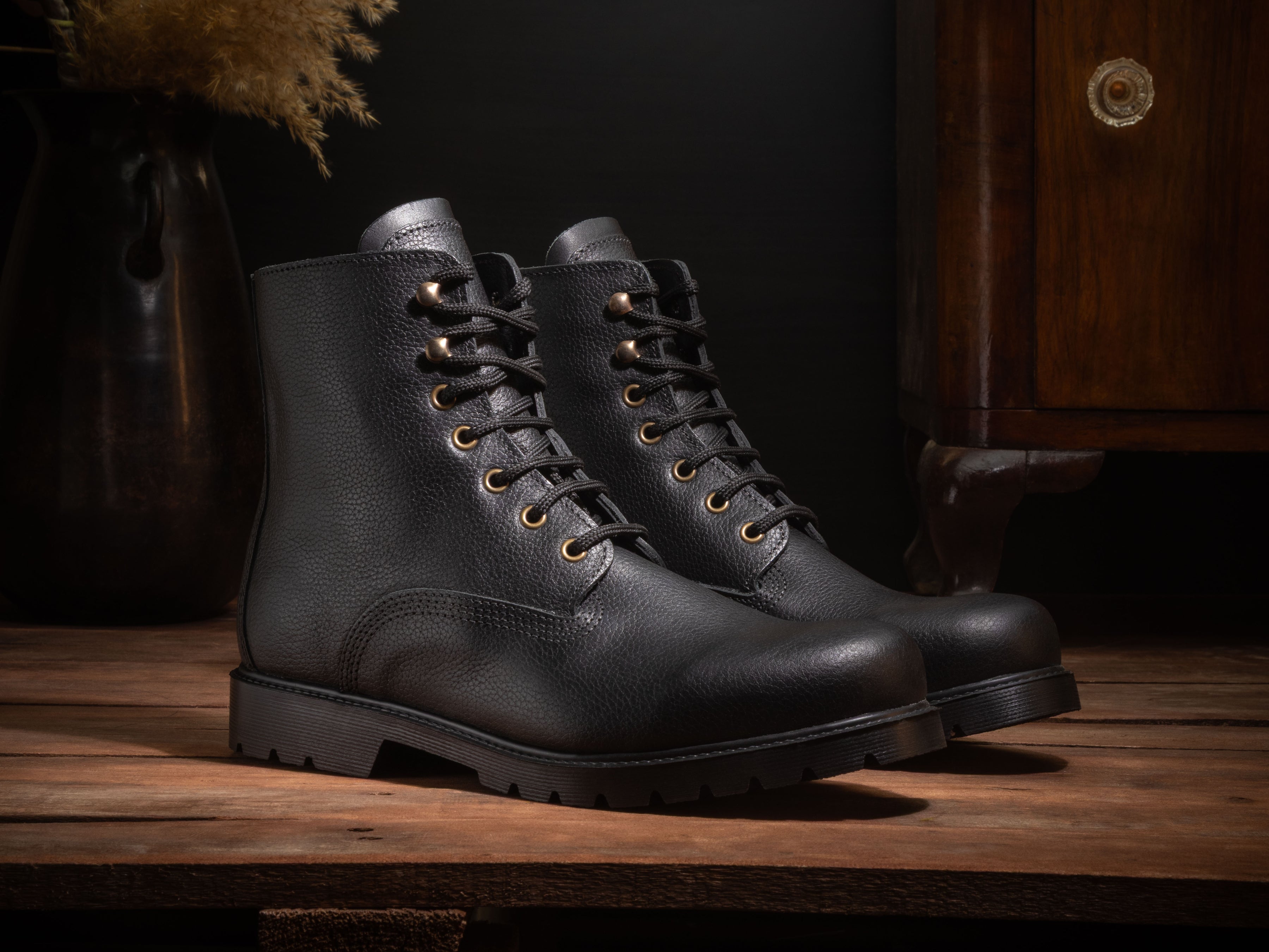 - Two premium sole options — (1) Vibram® full rubber lug, (2) Vibram® dual pad with wooden heel + leather midsole