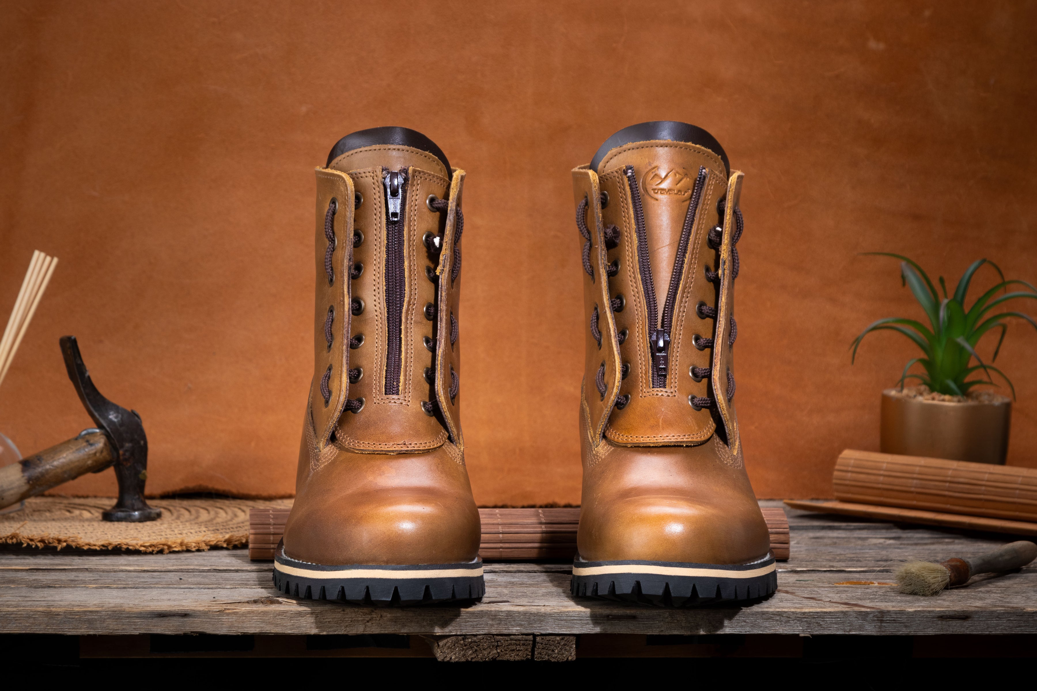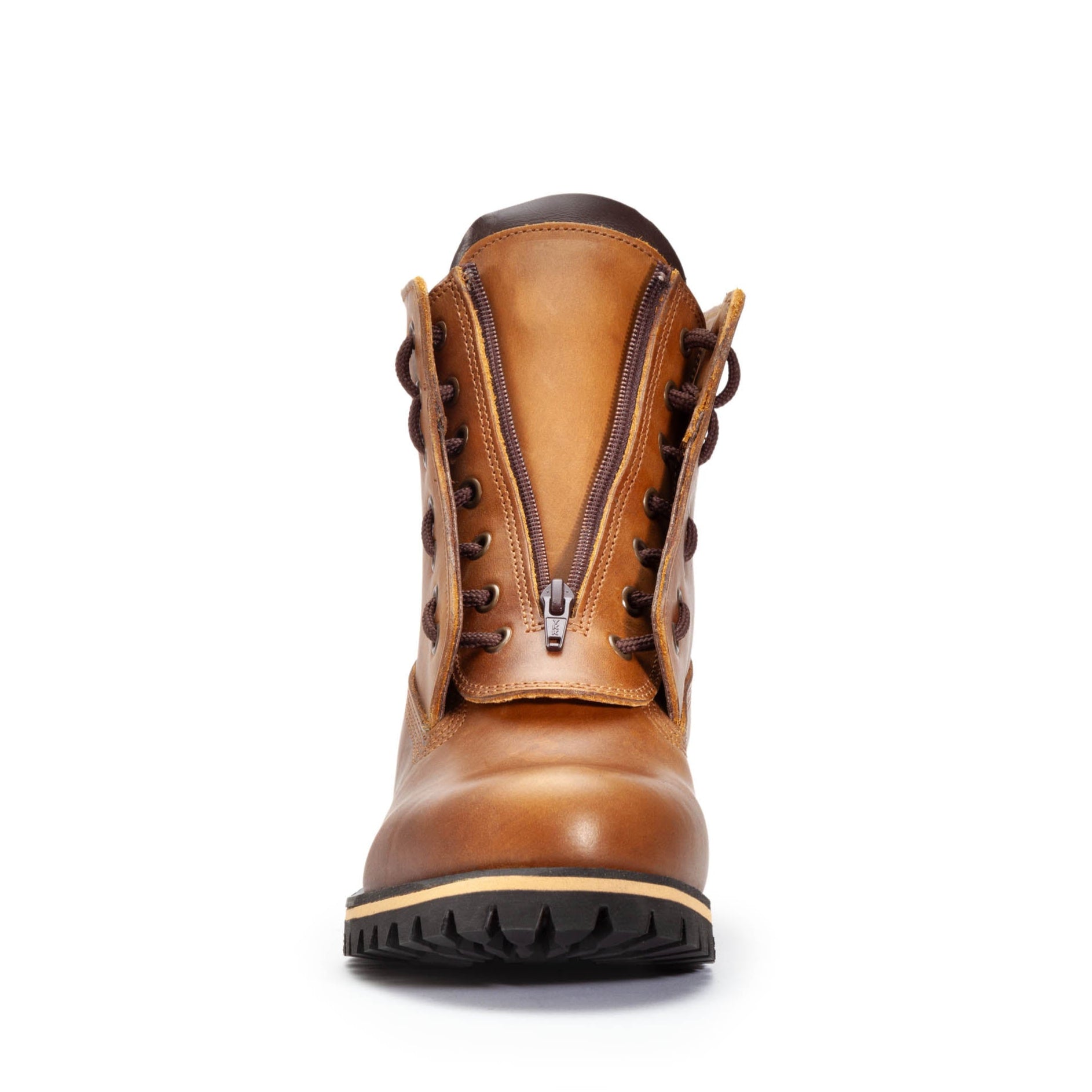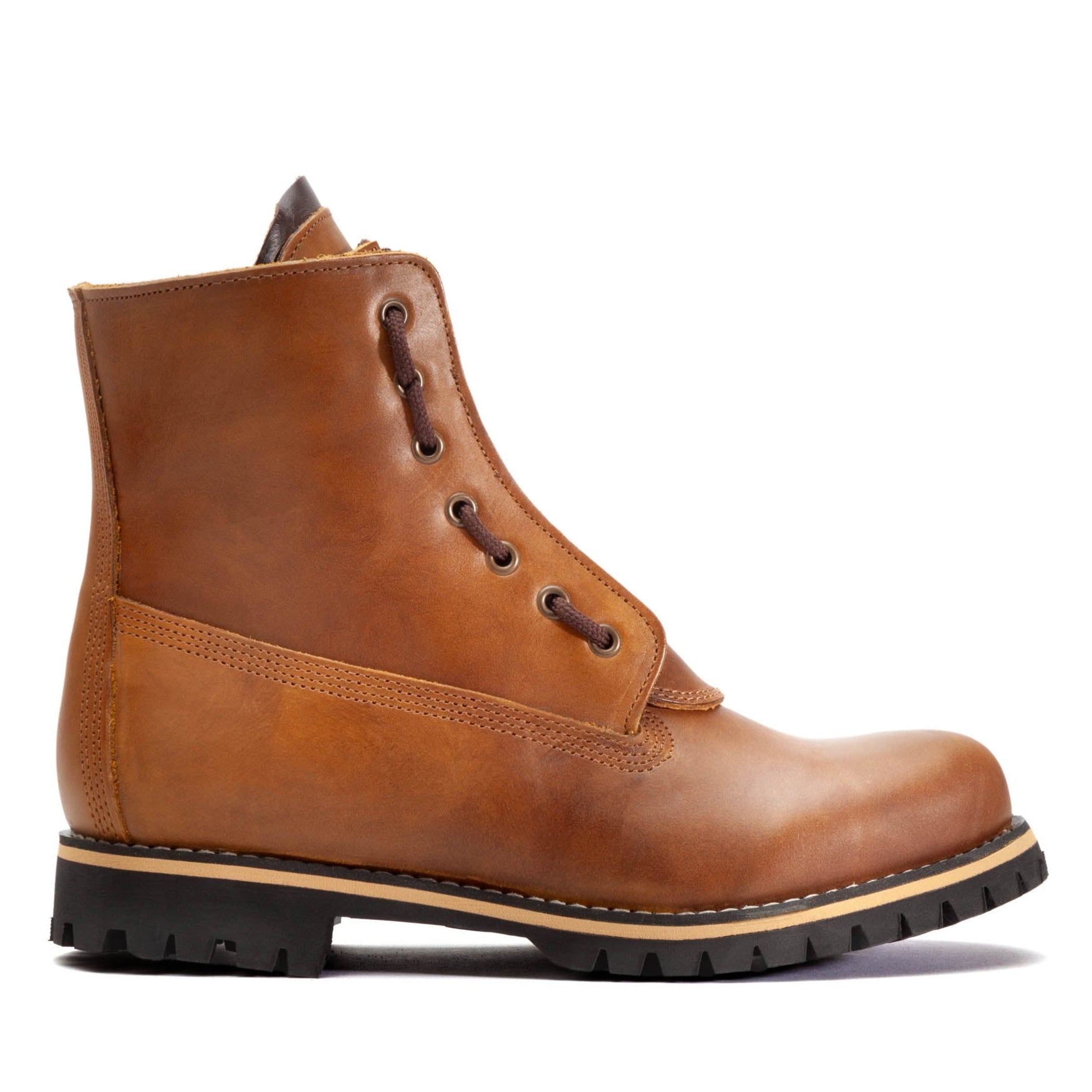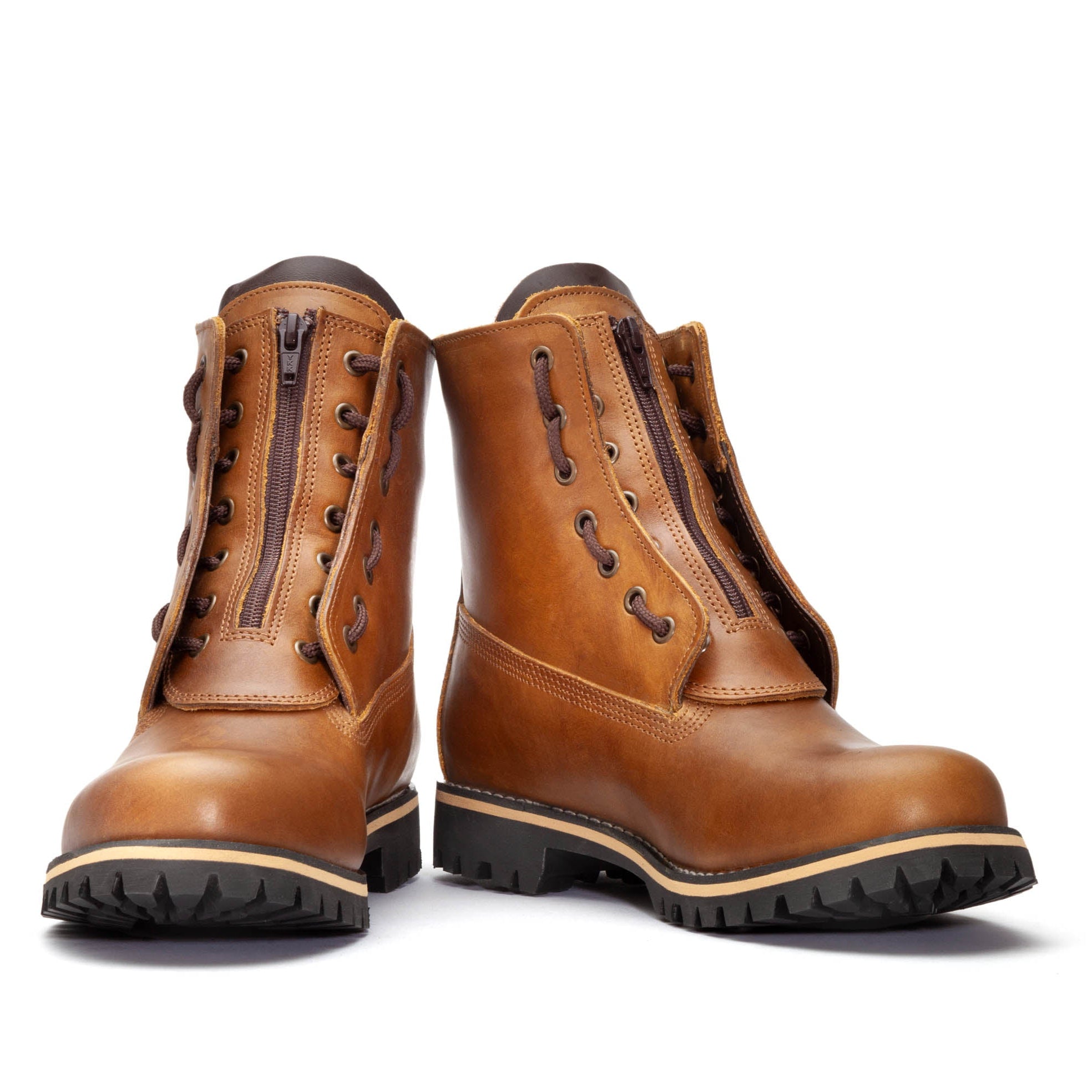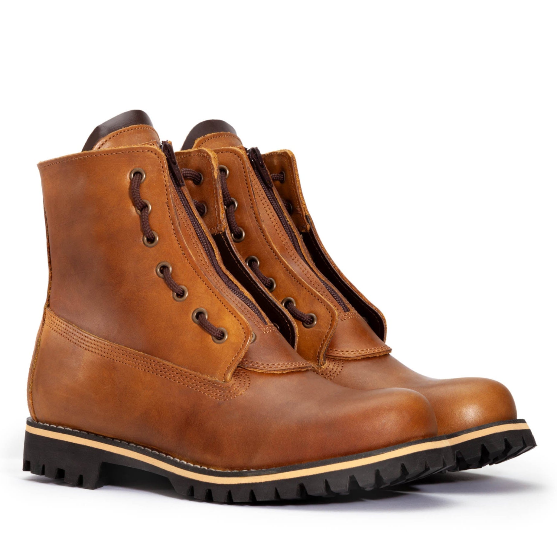 Men’s 8" (20 cm) top-grain leather boots with a front zipper and removable split tongue for dual-mode wear. Shown here in Waxed Tobacco. Handmade and tested in Laconia, Greece, delivering durability, support, and grip from winter streets to rugged trails.